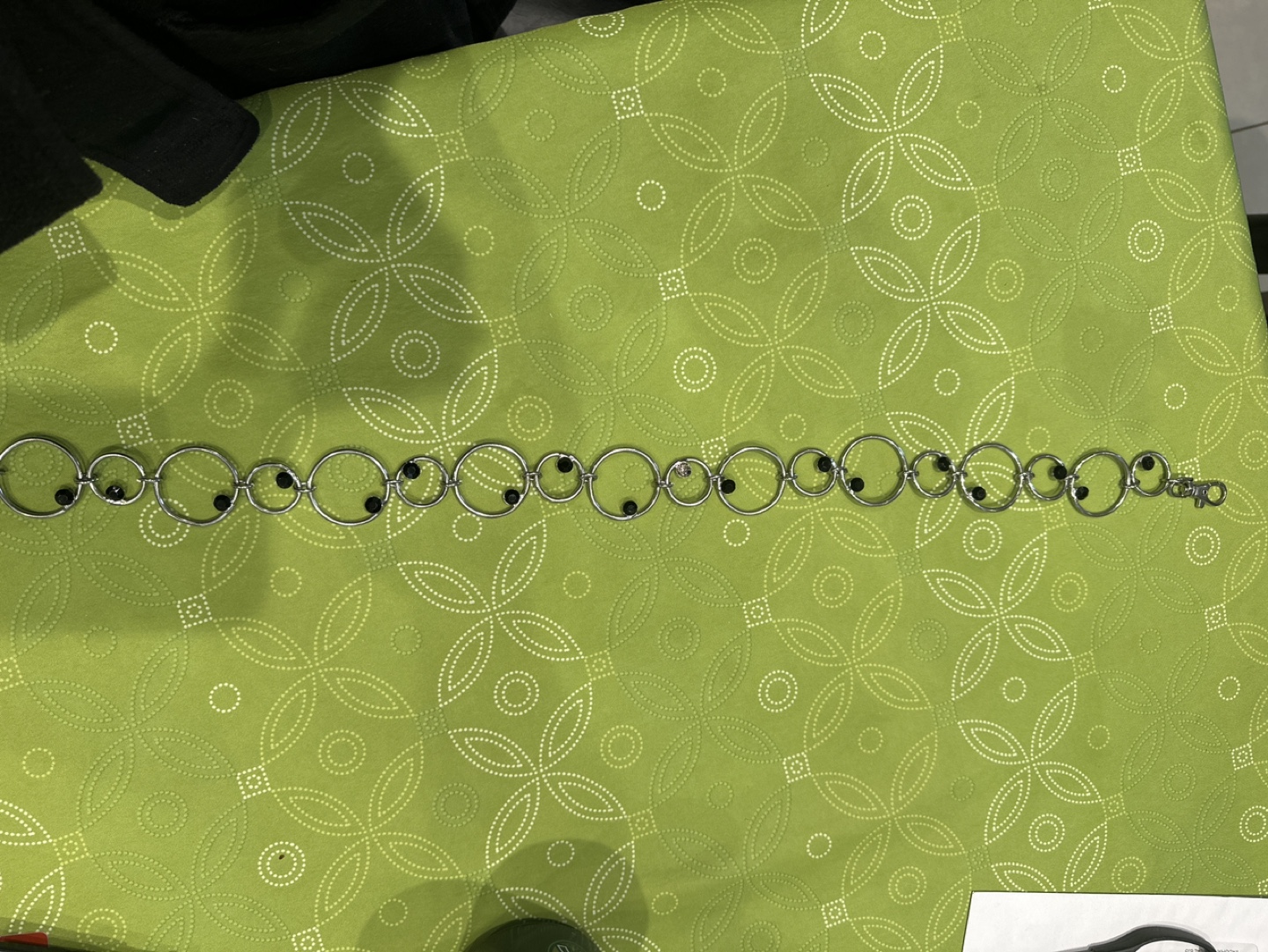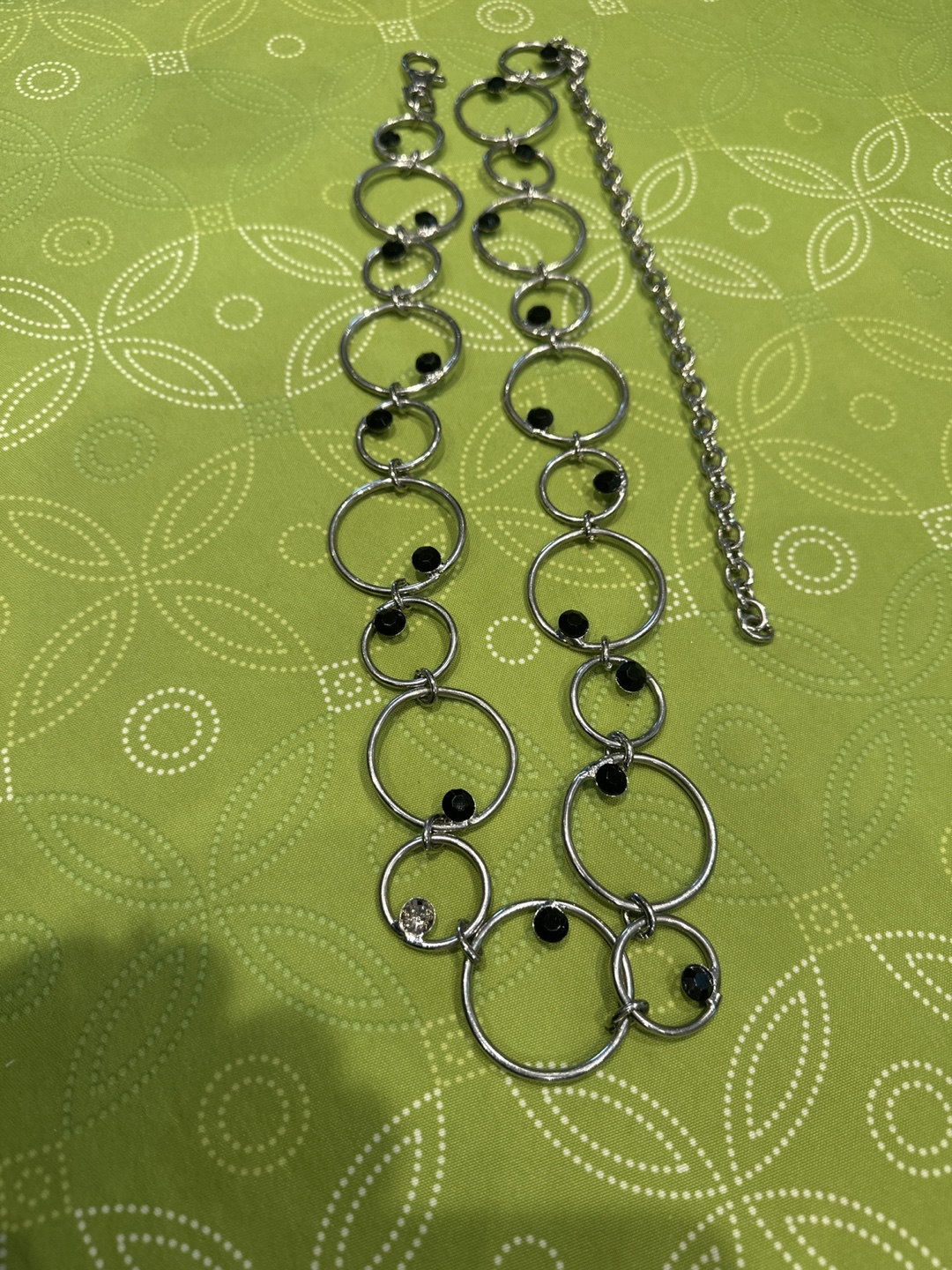 Silver chain belt with black rhinestones. Great for adding some sparkle to your outfit.
