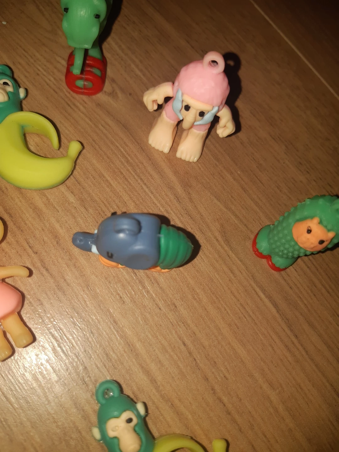 This collection includes 11 assorted small plastic figurines. They feature various characters and animals like a monkey with a banana and a frog on a tire. These toys are great for imaginative play.