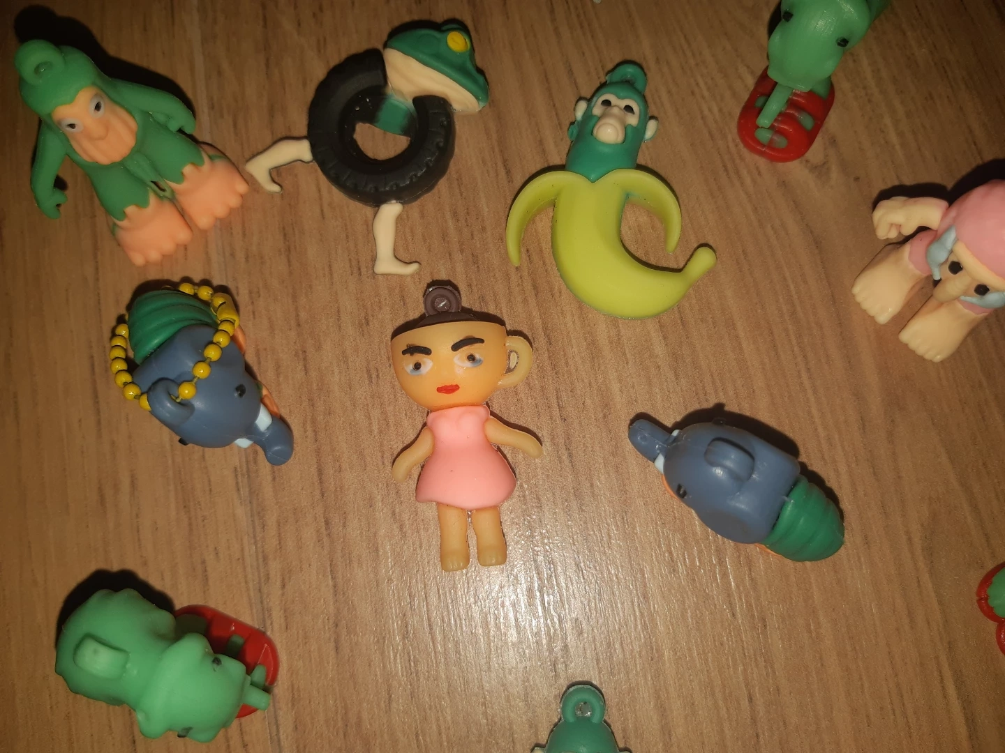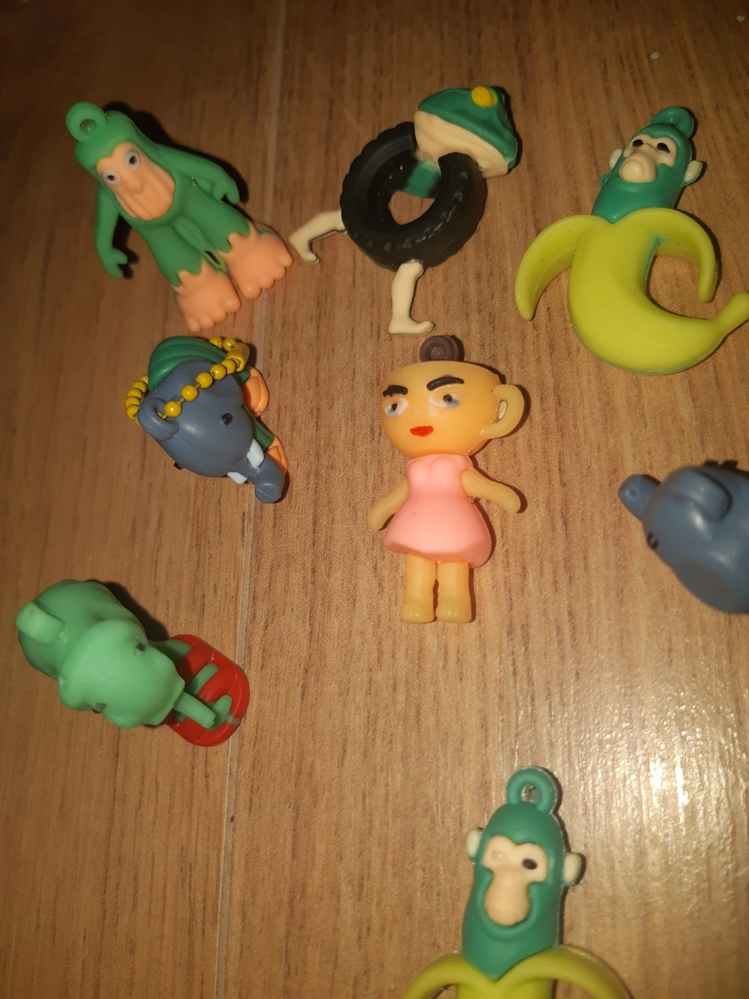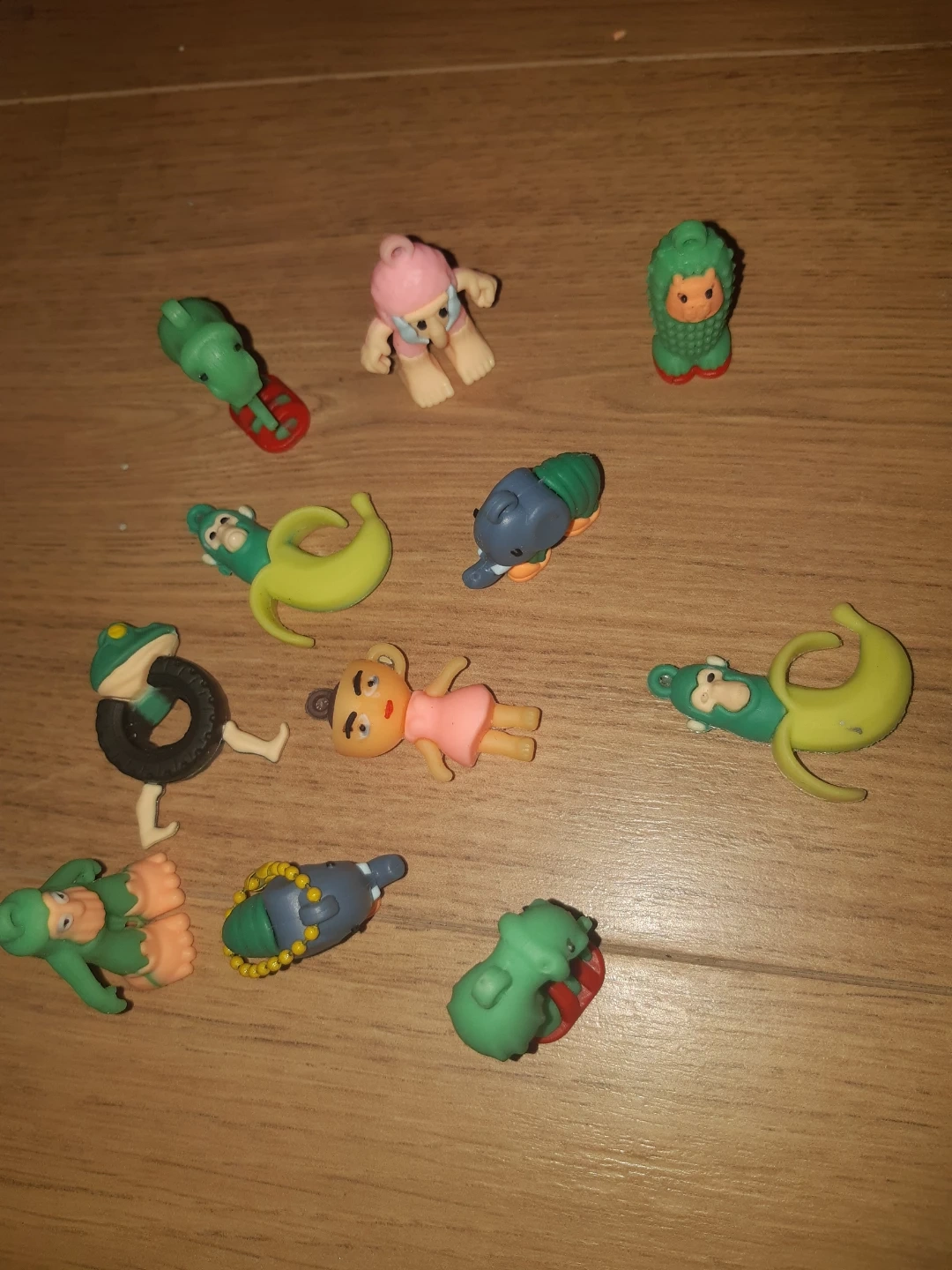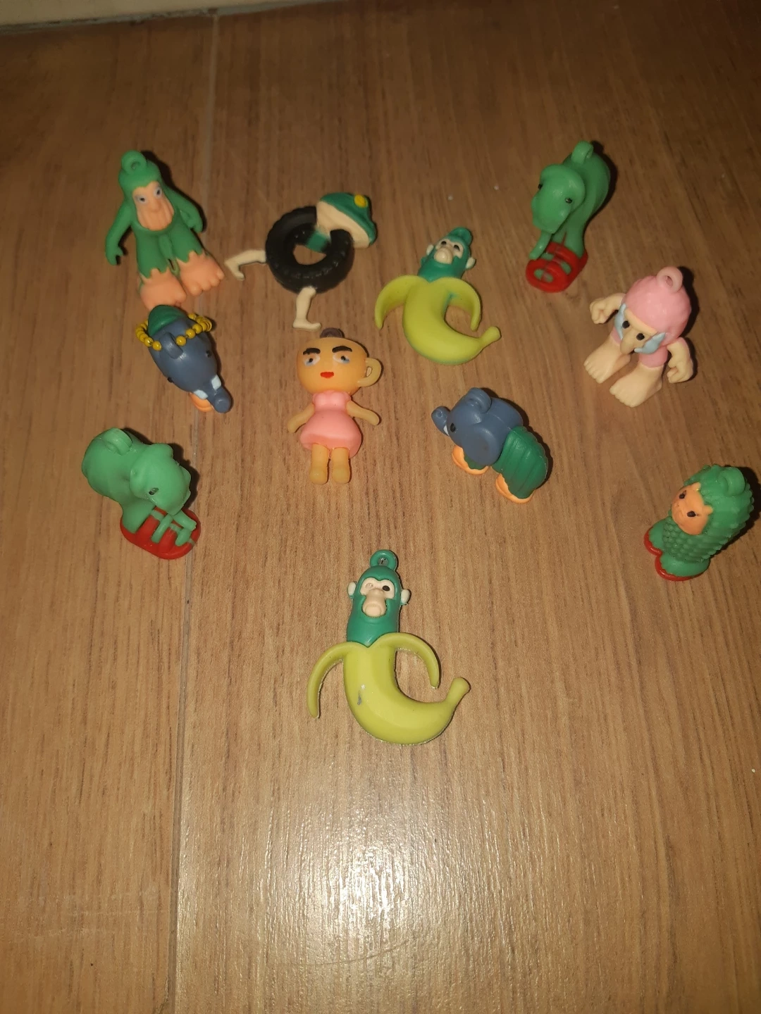 This collection includes 11 assorted small plastic figurines. They feature various characters and animals like a monkey with a banana and a frog on a tire. These toys are great for imaginative play.