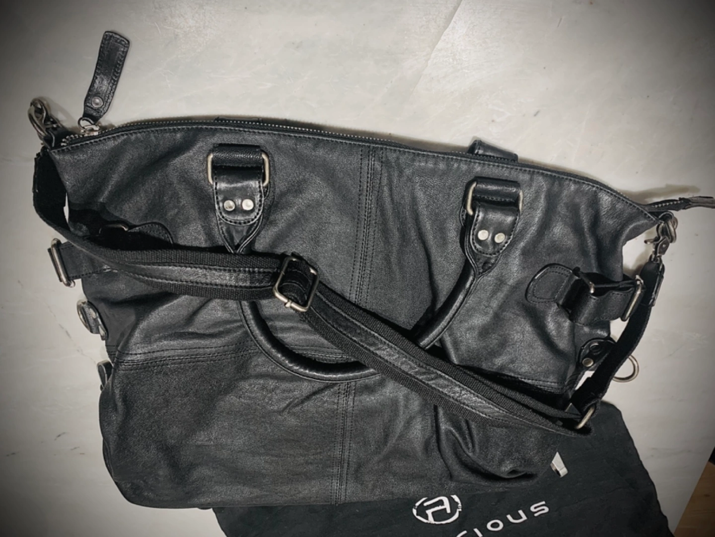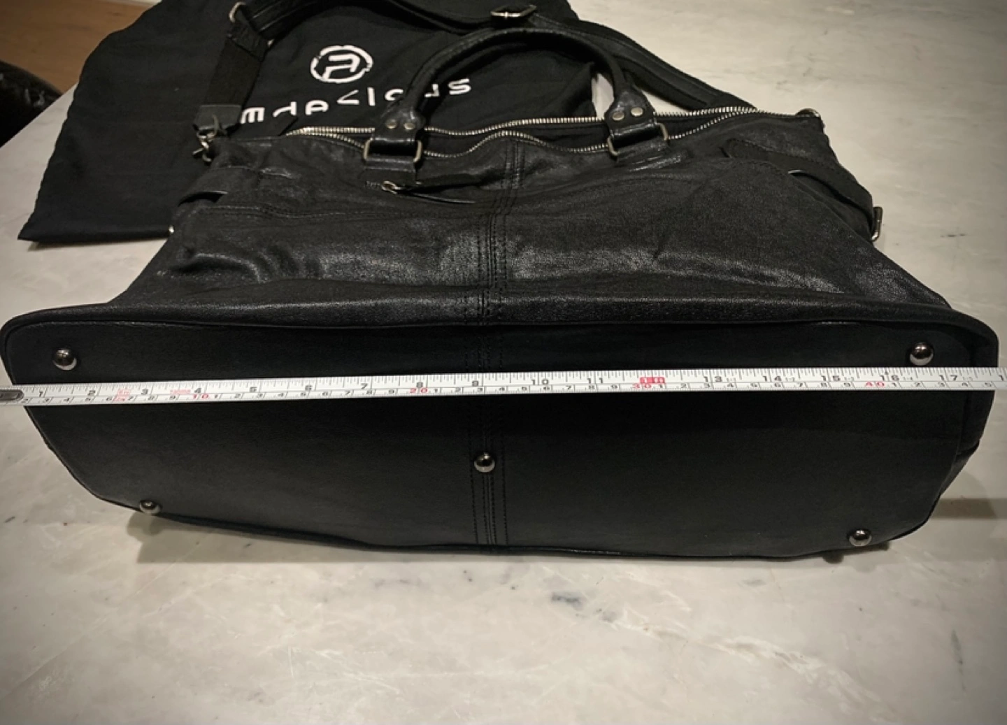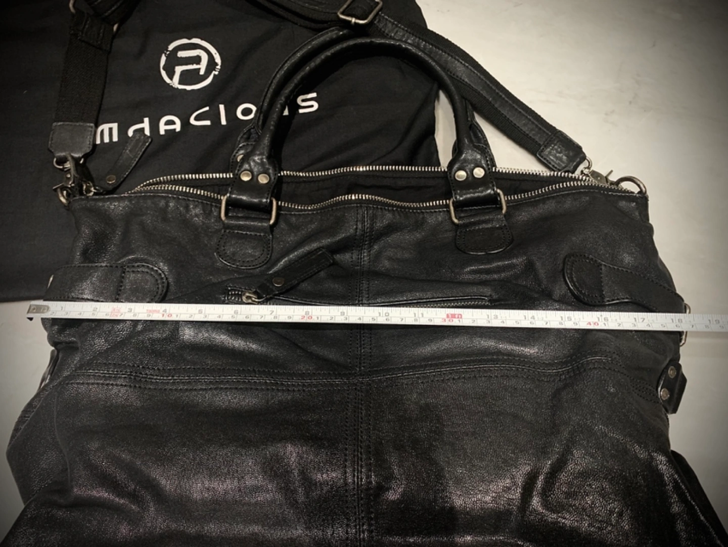 a black leather Amadacious London bag with its original storage dust bag. ✔️ Material: Genuine leather ✔️ Size: • Width: ~50 cm (19.6 inches) • Depth: ~15 cm (5.9 inches) • Height: ~35 cm (13.7 inches) ✔️ Features: • Spacious design – perfect for travel, work, or everyday use • Multiple compartments: • Side pockets for easy access • Large zippered middle compartment for secure storage • Durable metal studs on the bottom for protection • Sturdy handles & detachable shoulder strap ✔️ Like new – barely used, in excellent condition. This version highlights its brand, features, and condition in a clear and attractive way. Let me know if you’d like any further adjustments!
