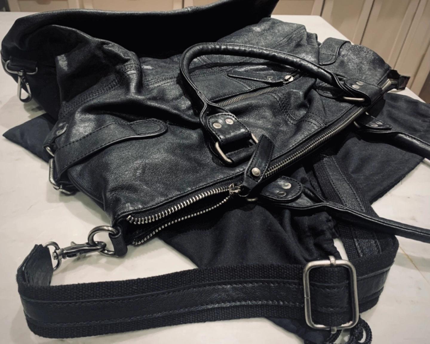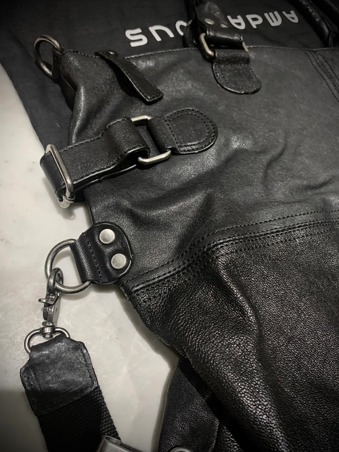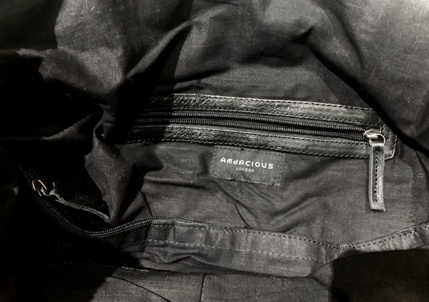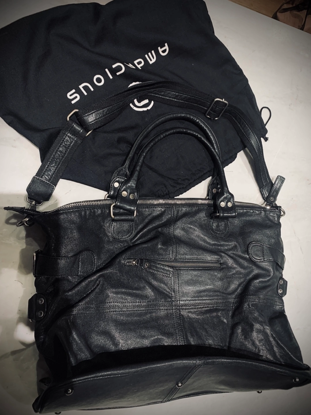 a black leather Amadacious London bag with its original storage dust bag. ✔️ Material: Genuine leather ✔️ Size: • Width: ~50 cm (19.6 inches) • Depth: ~15 cm (5.9 inches) • Height: ~35 cm (13.7 inches) ✔️ Features: • Spacious design – perfect for travel, work, or everyday use • Multiple compartments: • Side pockets for easy access • Large zippered middle compartment for secure storage • Durable metal studs on the bottom for protection • Sturdy handles & detachable shoulder strap ✔️ Like new – barely used, in excellent condition. This version highlights its brand, features, and condition in a clear and attractive way. Let me know if you’d like any further adjustments!