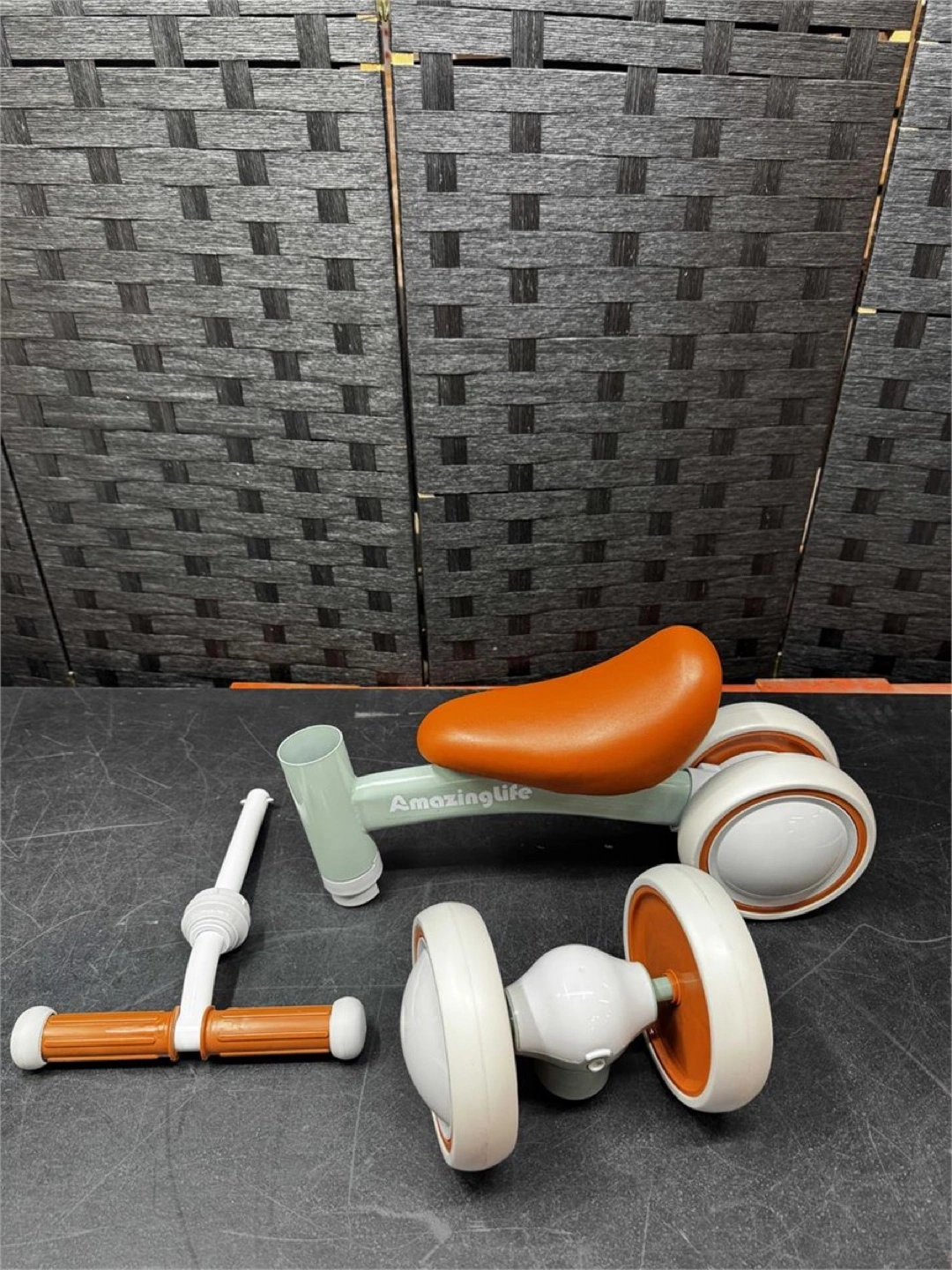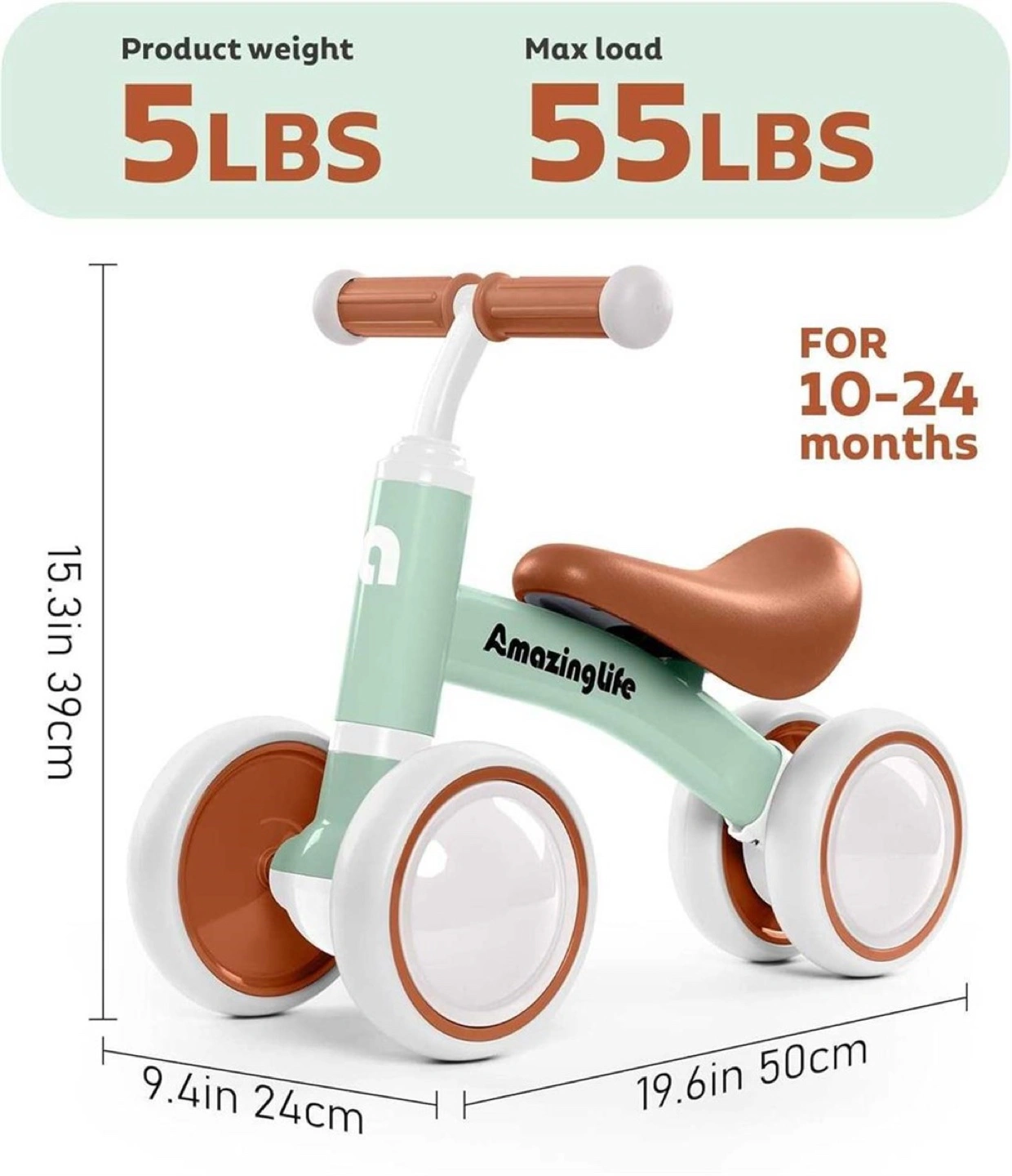 This cute little balance bike is perfect for little ones aged 10-24 months! It can hold a max load of 55lbs and weighs only 5lbs itself, making it easy to move around. The dimensions are 15.3in (39cm) in height, 9.4in (24cm) in width, and 19.6in (50cm) in length, perfect for your growing child