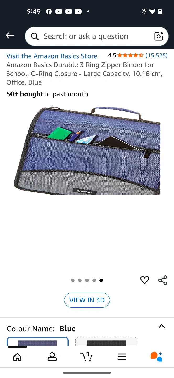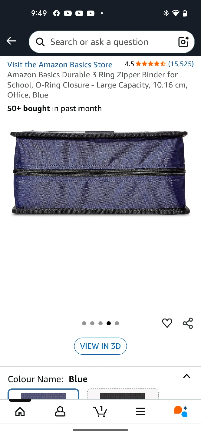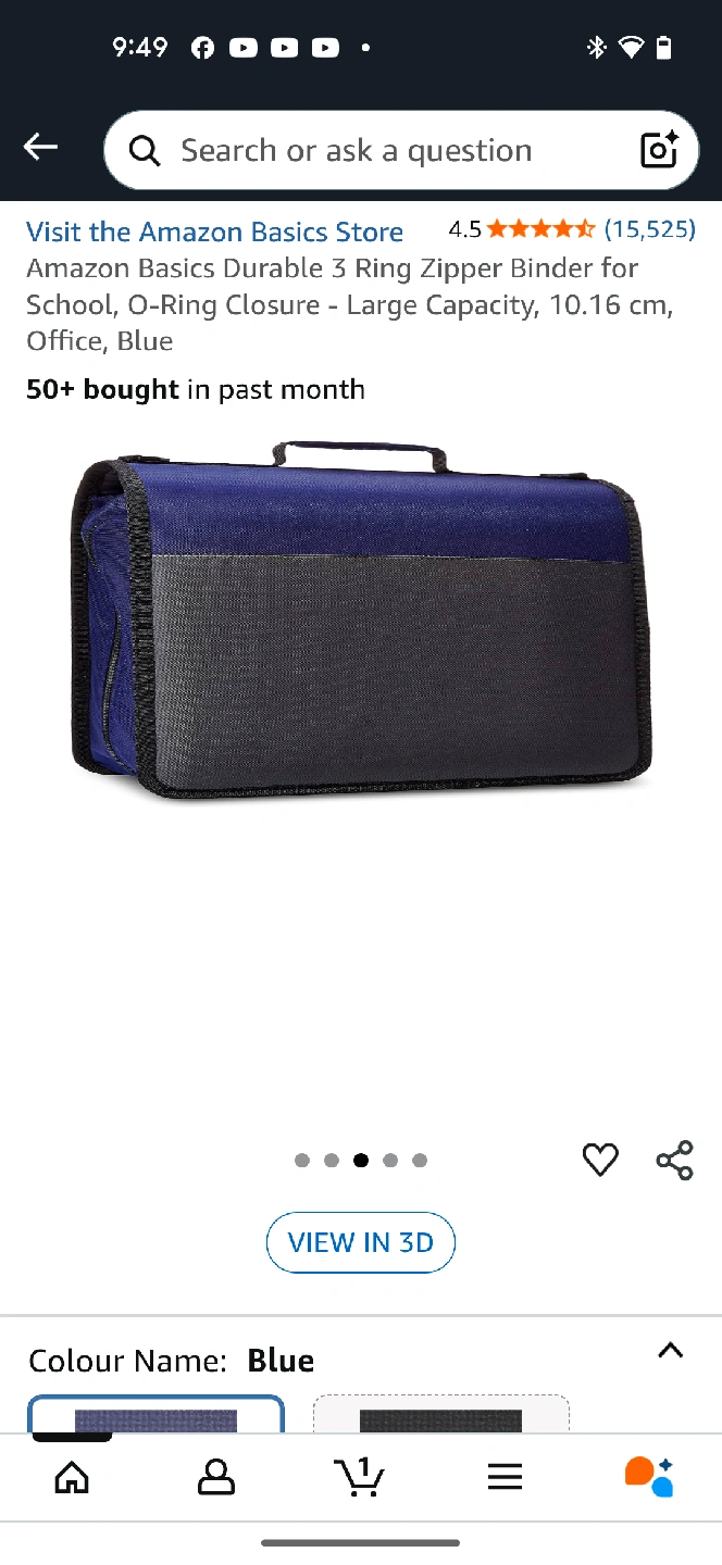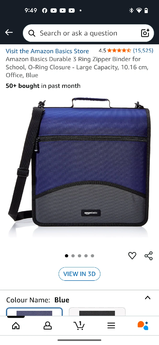 Looking to sell this Amazon Basics durable 3-ring zipper binder! It's perfect for school, office, or home. It has an O-ring closure and a large capacity. The colour is blue!