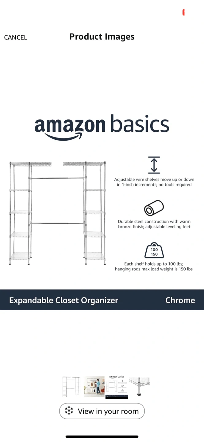 Selling an Amazon Basics Expandable Closet Organizer in chrome. It features adjustable wire shelves that move up or down in 1-inch increments, so no tools are required for adjustments. The durable steel construction has a warm bronze finish and adjustable leveling feet. Each shelf holds up to 100 lbs, and the hanging rods have a max load weight of 150 lbs