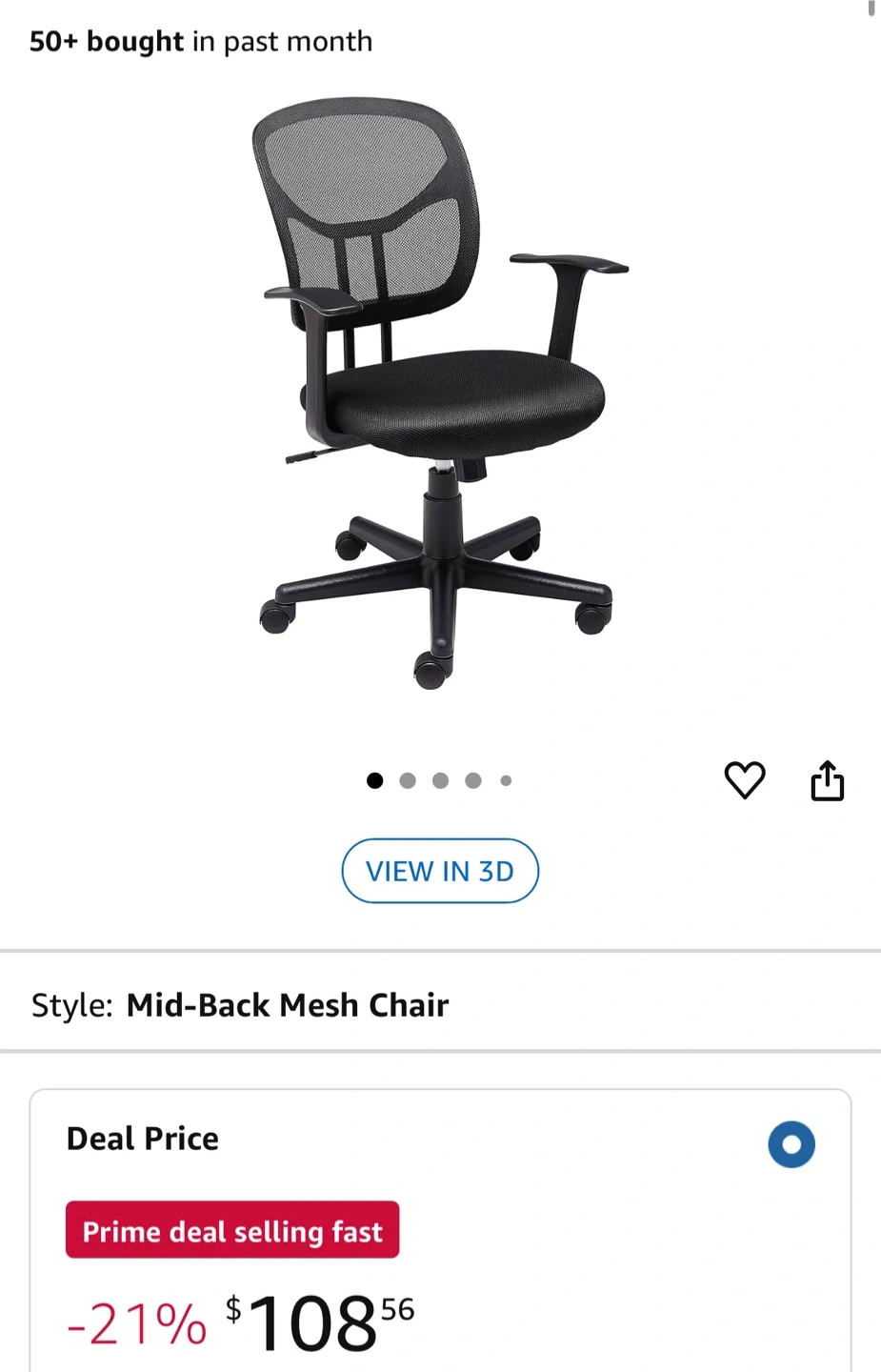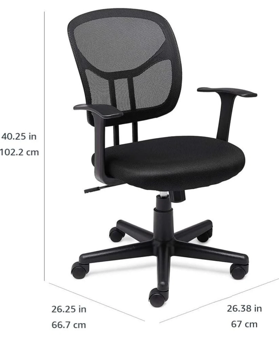 Selling a comfy mid-back mesh office chair in black! It's in great shape and perfect for your home office or study space. The breathable mesh back keeps you cool, and the adjustable height makes it easy to find the perfect fit. Dimensions are approximately 40.25 inches (102.2 cm) in height, 26.25 inches (66.7 cm) in depth, and 26.38 inches (67 cm) in width. Originally listed for $108.56!