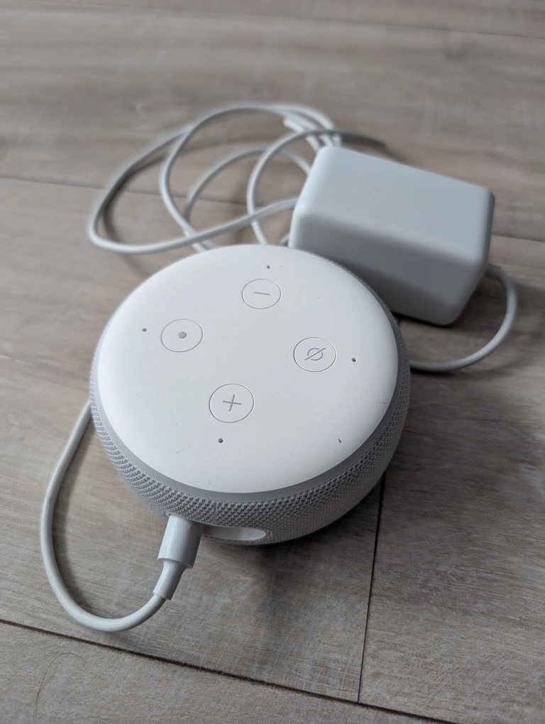 126Smart speaker with Alexa. Compact design. Includes power adapter and cable. Slightly used.