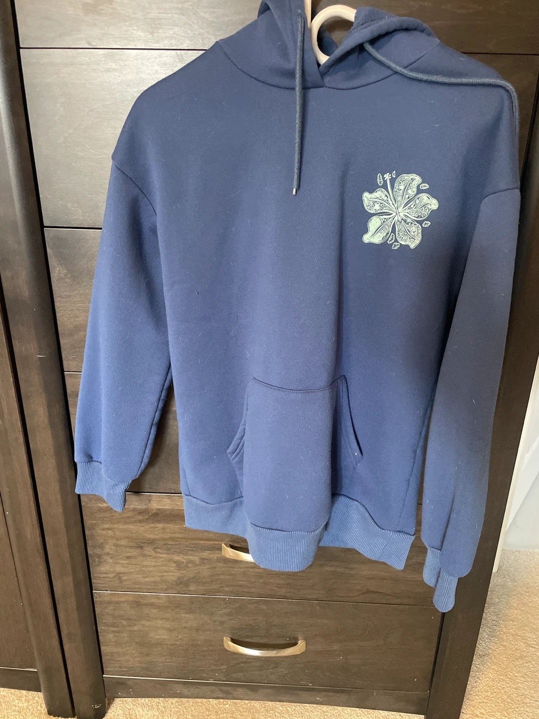 10Selling a comfy navy blue hoodie! It features a unique flower design on the front and back. It's in great condition and perfect for layering or wearing on its own