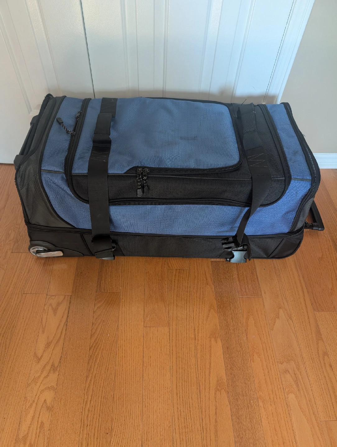 This is a big size AmazonBasics rolling duffel bag in blue and black. 80x40 cm. It has a telescoping handle and wheels for easy transport. One pocket cannot be closed because of the missing slider - please see the last picture, otherwise it's in a very good shape.
