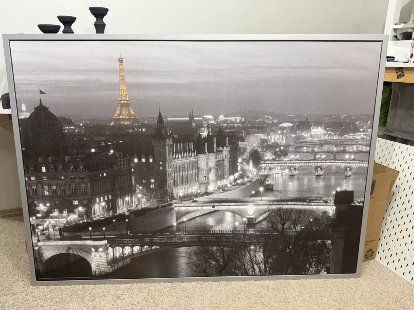 Large framed art print featuring a black and white cityscape of Paris at night, with the Eiffel Tower illuminated. It's a statement piece for any room.