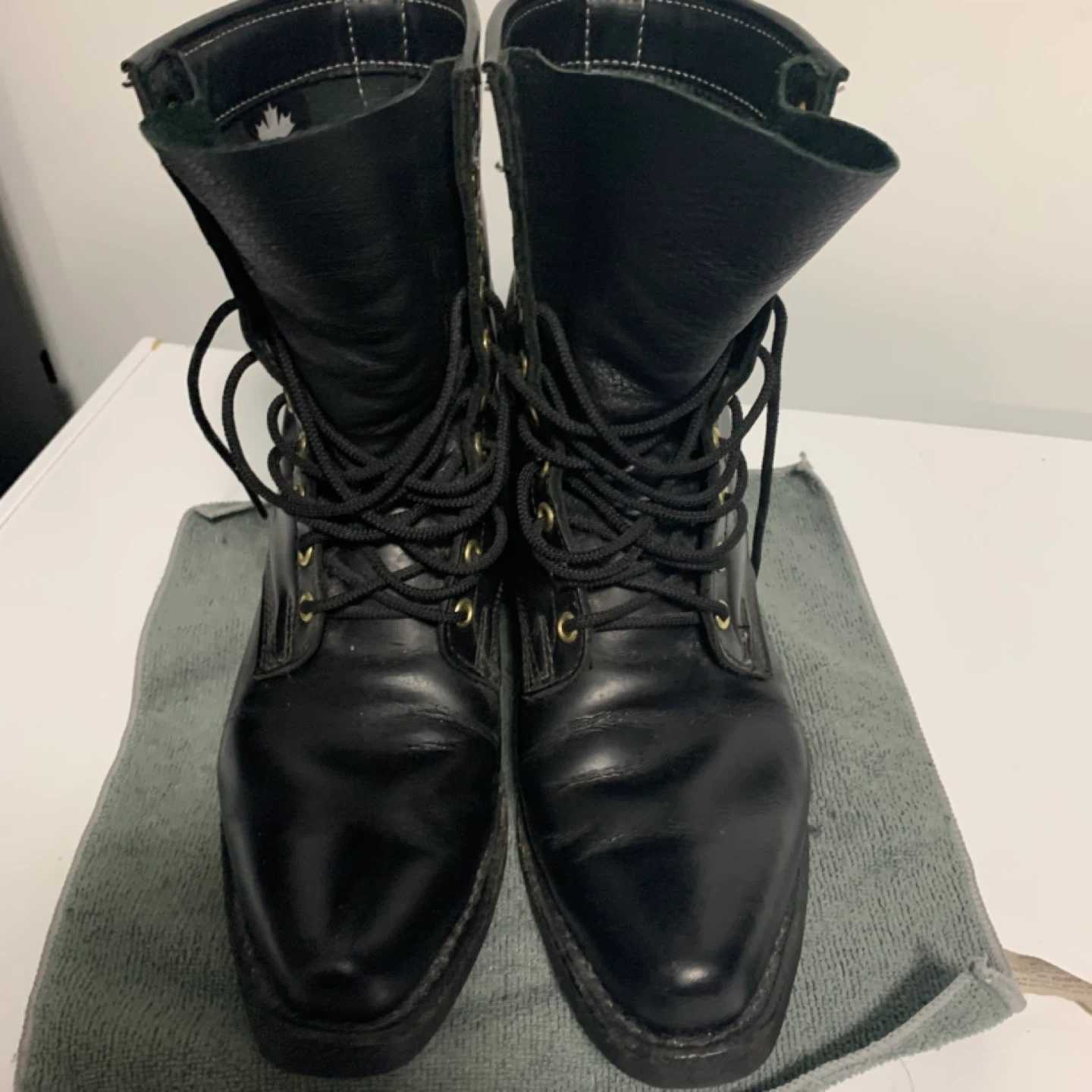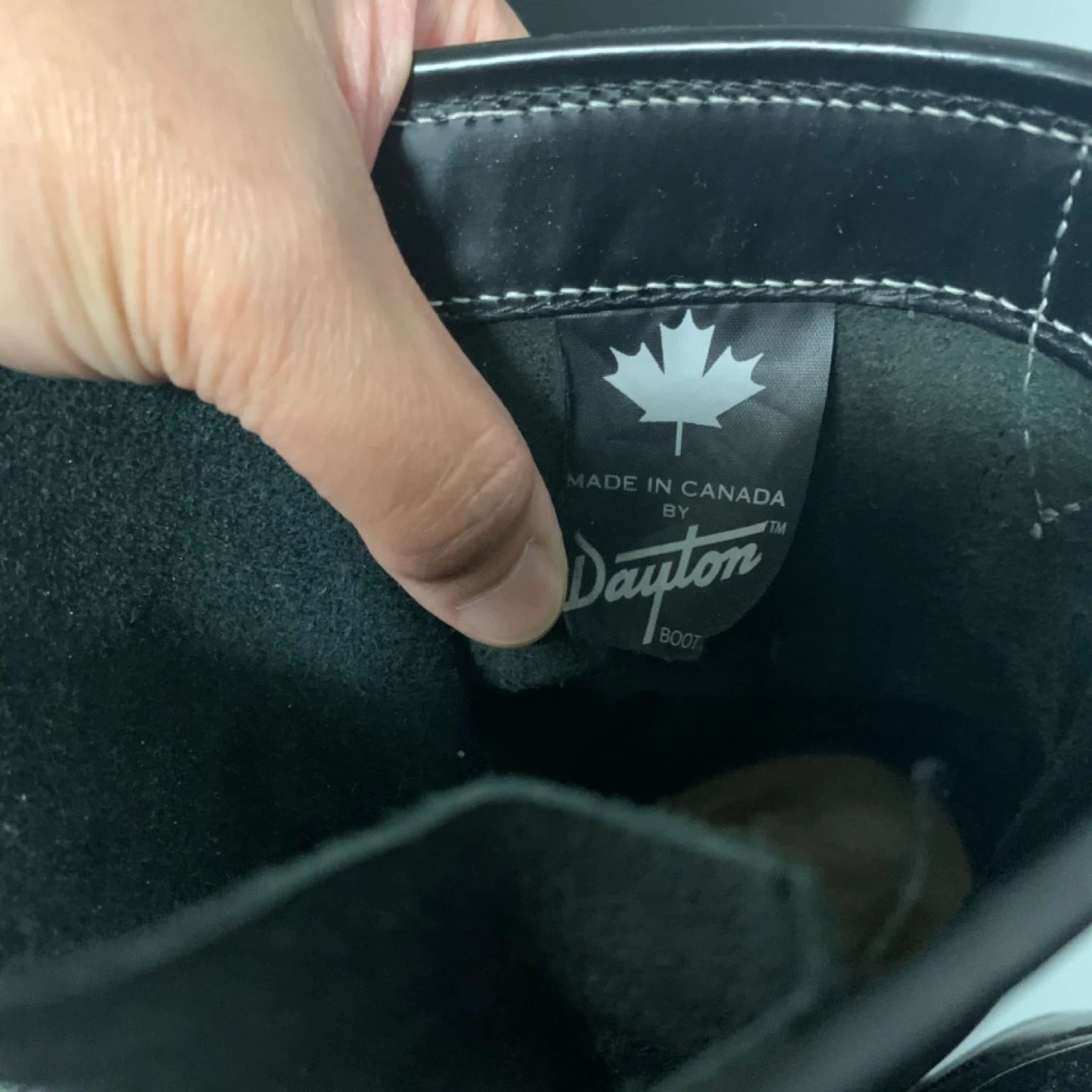 Black leather Dayton work boots made in Canada. These boots have a lace-up front and a sturdy design. They're built for durability and comfort on the job. A reliable choice for tough work environments!