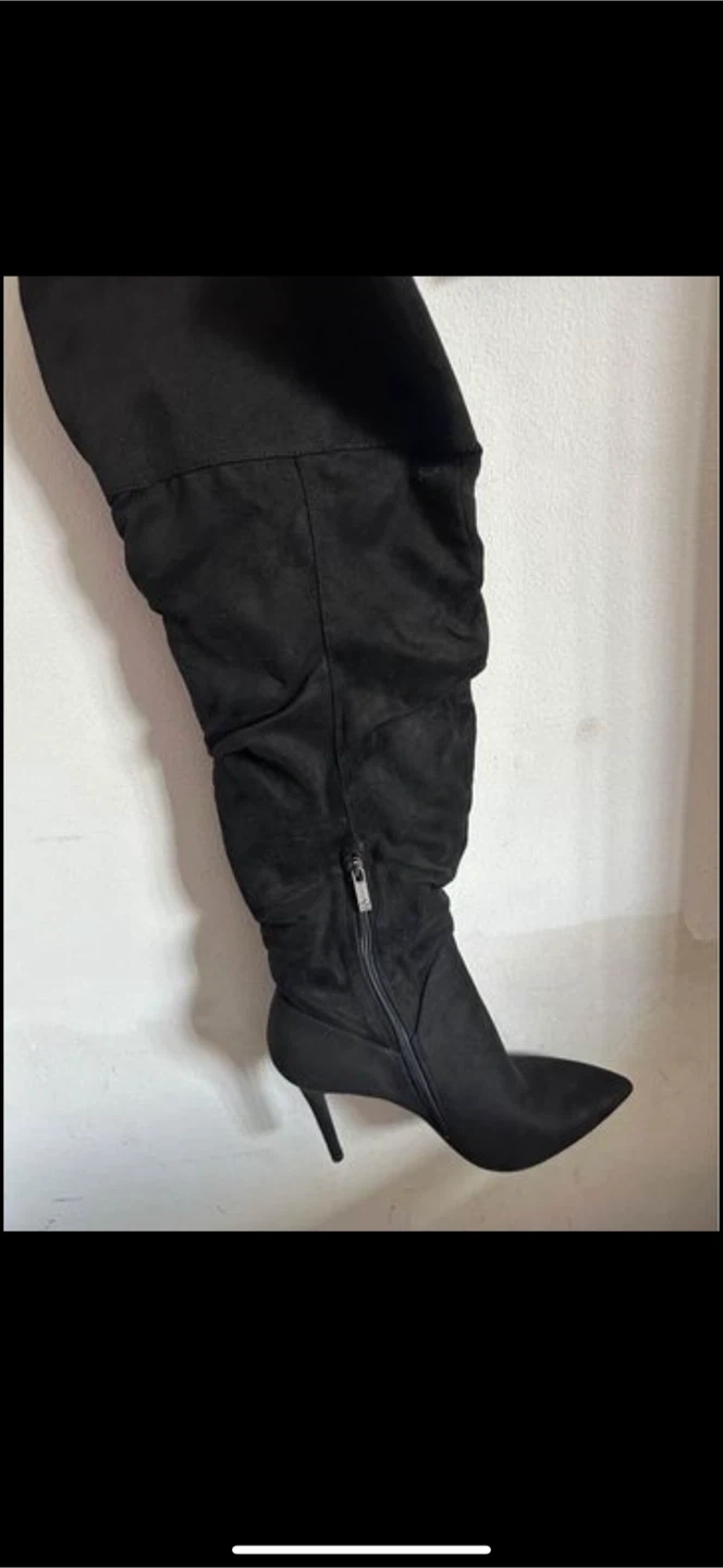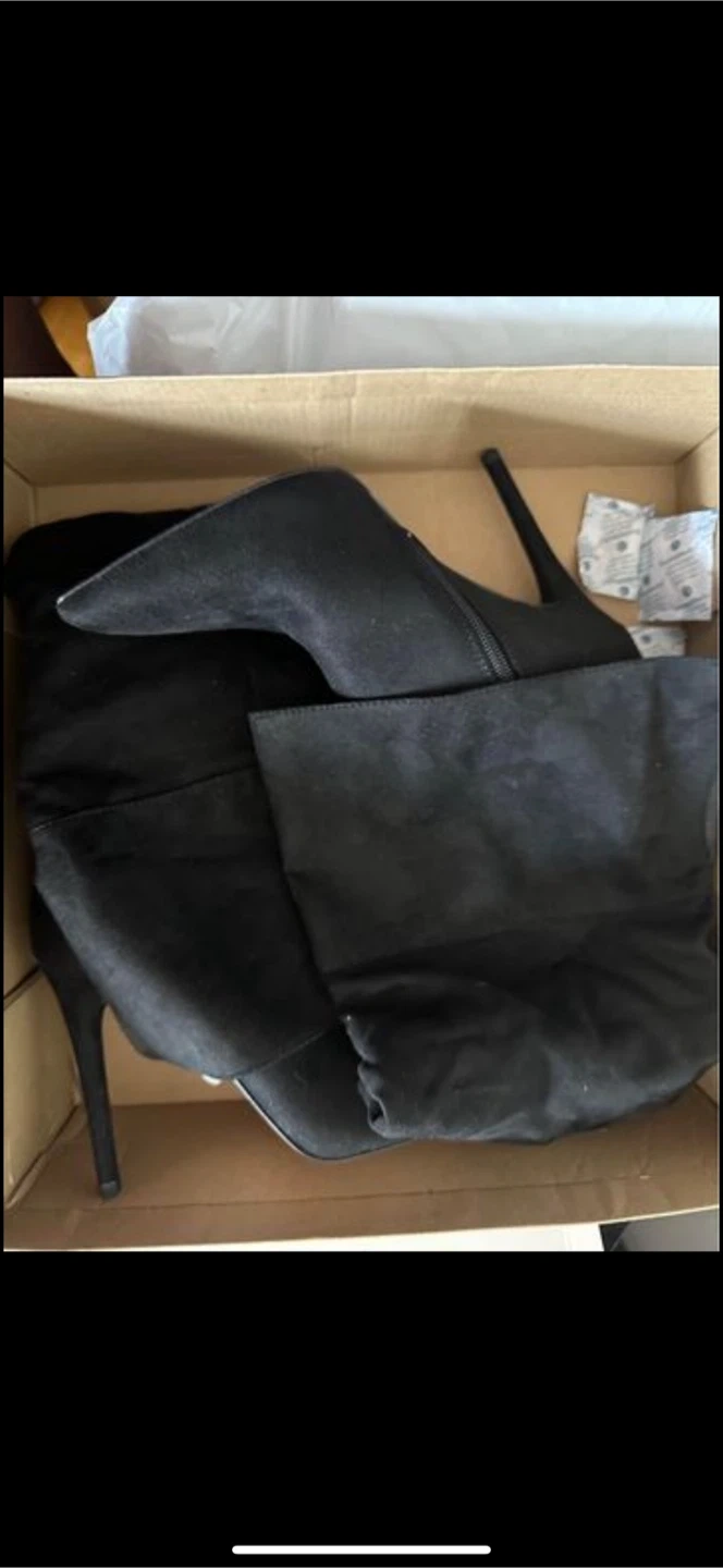 Selling a pair of thigh-high black boots, size 10. They come in their original box. Perfect for adding a touch of style to your wardrobe!