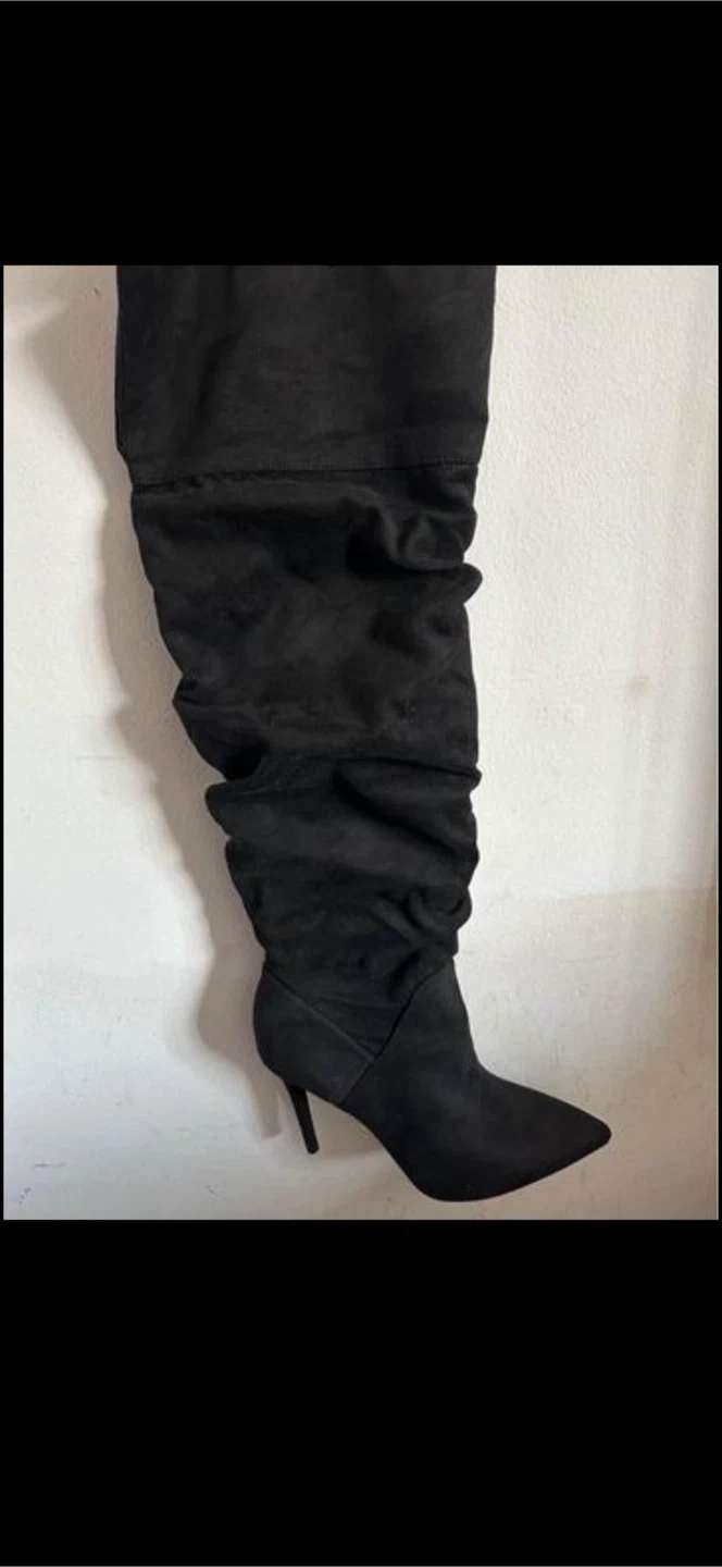 Selling a pair of thigh-high black boots, size 10. They come in their original box. Perfect for adding a touch of style to your wardrobe!