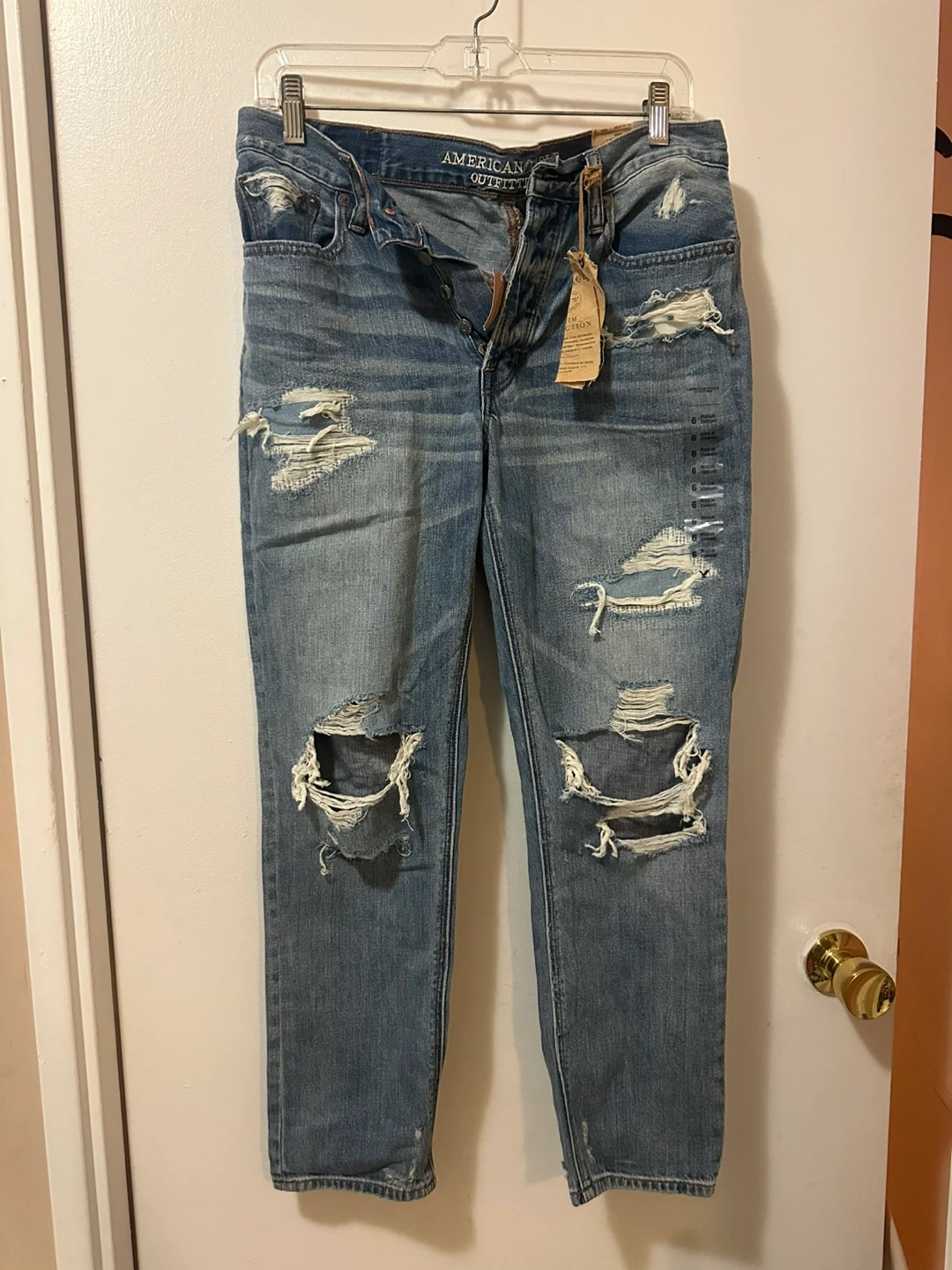 10Selling a pair of American Eagle jeans in size 6. They have a distressed look with rips and tears throughout. Perfect for a casual, edgy style!