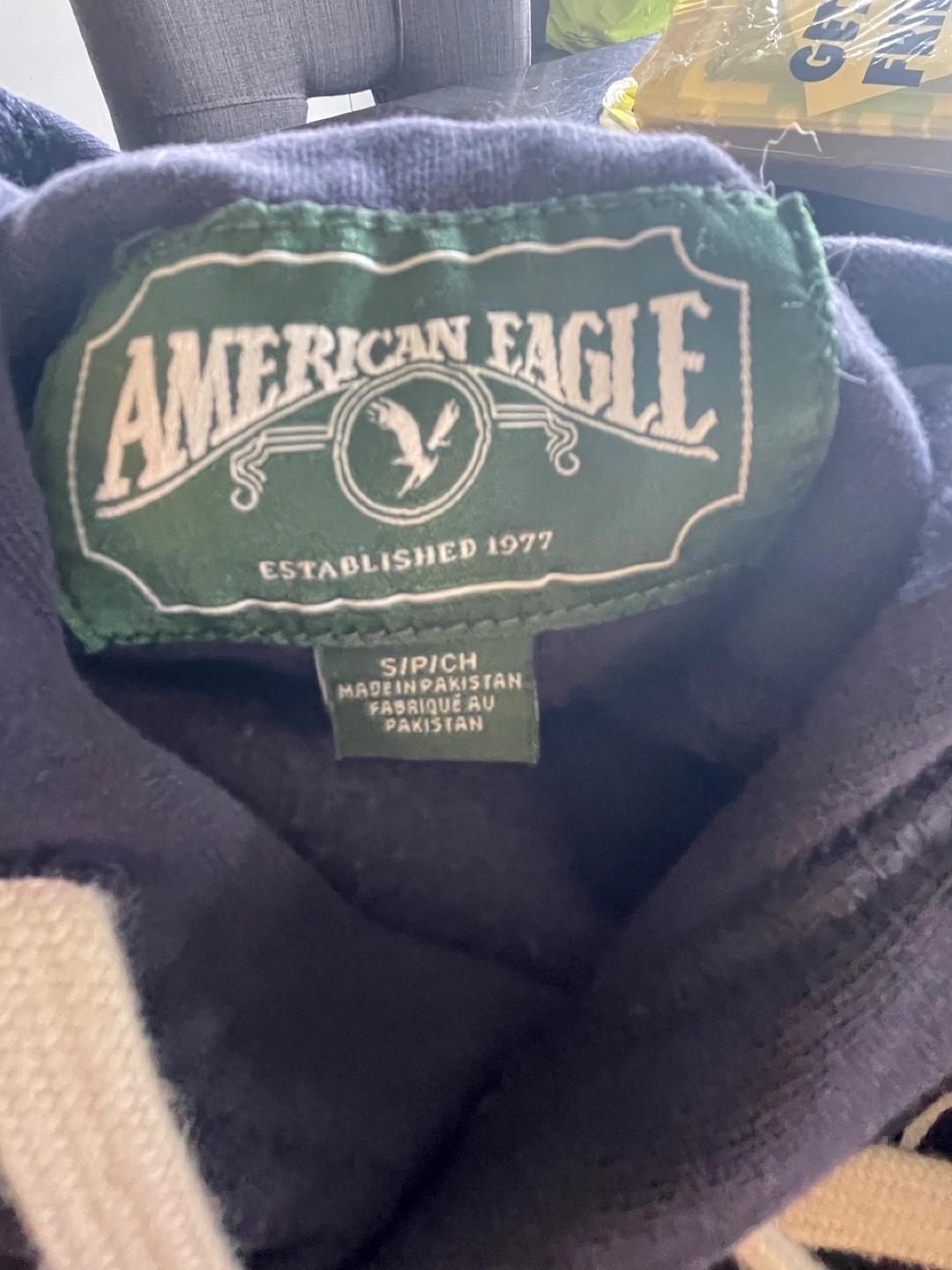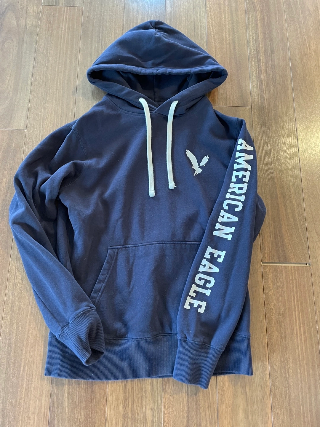 Selling a comfy American Eagle hoodie in navy blue! It's a size small and has the classic logo on the sleeve and chest. Perfect for layering or just lounging around. New without tags