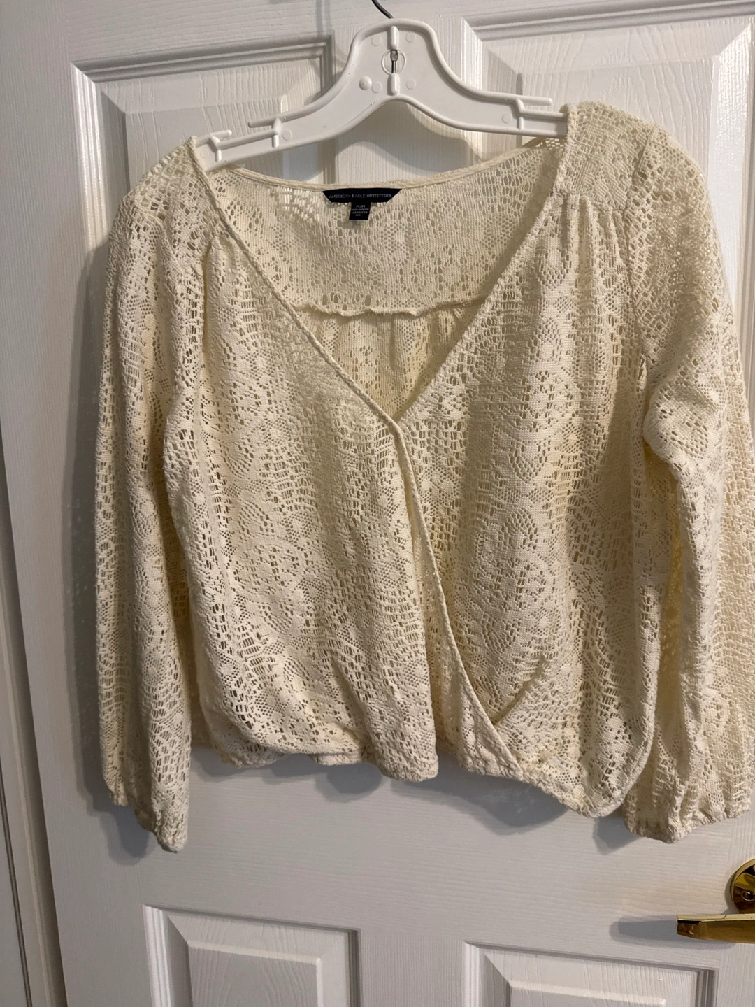13Cream-coloured lace blouse. Long sleeves. V-neck. Wrap style. Size M.