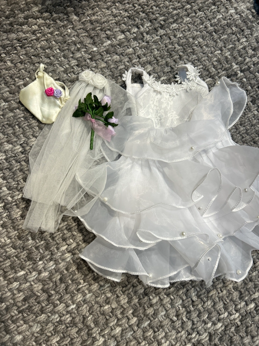 Great condition White wedding dress White wedding veil Bouquet of flowers White purse with two flowers