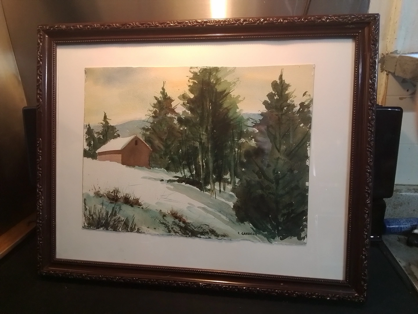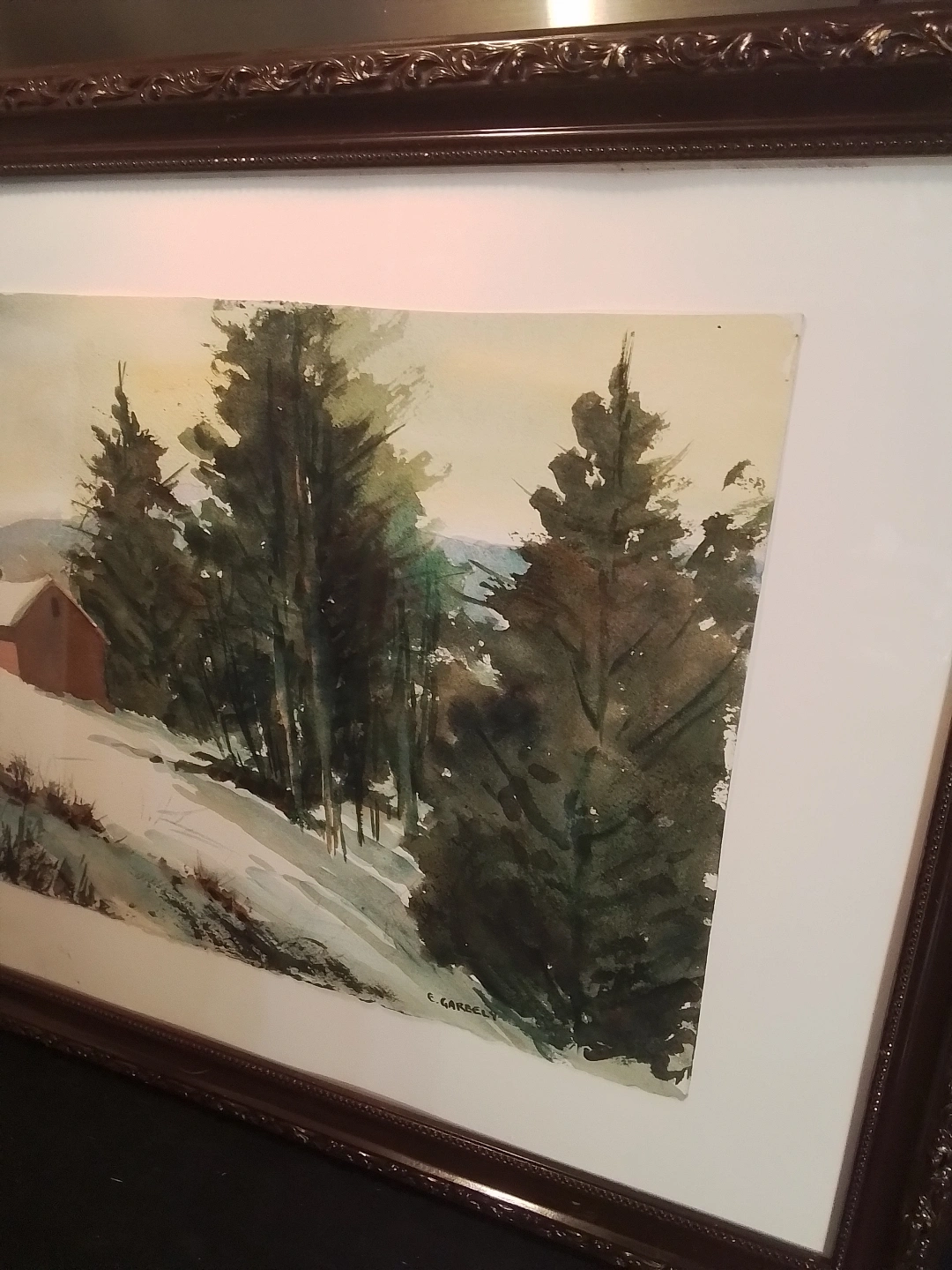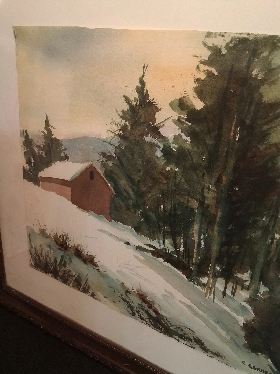 114American Watercolor on Paper Signed Edward Garbely This is an American watercolor on paper signed by Edward Garbely, showcasing a serene winter scene with a cozy cabin nestled among snow-covered trees. This piece has been previously owned and is in good condition, ready to bring a touch of rustic charm to any room. Watercolor on paper. Featuring snow landscape painting. Signed E. Garbely on bottom right corner. Attributed to Edward Garbely (1908 - 1999). 11.25 x 15 inches (28.6 x 38.1 cm), Frame 21.75 x 17.25 in. PROVENANCE: Private collection, Ohio, United States Ready to hang Country of Origin: USA It's like finding a little treasure, isn't it? If the ad is still up, yes, it is still available! Pickup at Young Street and Steels Ave