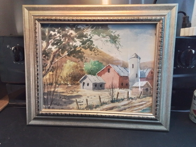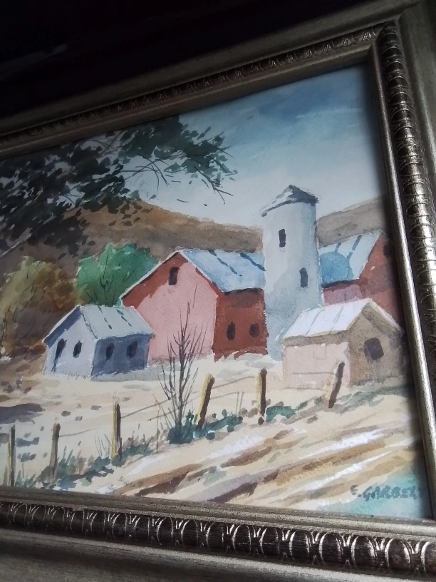 114American WC on Paper Signed Edward Garbely w/ Prov Watercolor on paper painting. Featuring an autumn landscape scene. Signed by Edward Garbely (1908-1999) on bottom right corner. Attributed to Edward Garbely (1908 - 1999). 11.25 x 15 inches. Provenance: Private collection, Ohio, United States Country of Origin: USA Lovely watercolor painting, framed. Depicts a rural scene with farm buildings and a silo. Silver coloured frame. Artist signature visible. Estimate 150.00 - 300.00 USD Pickup at Young Street and Steels Ave