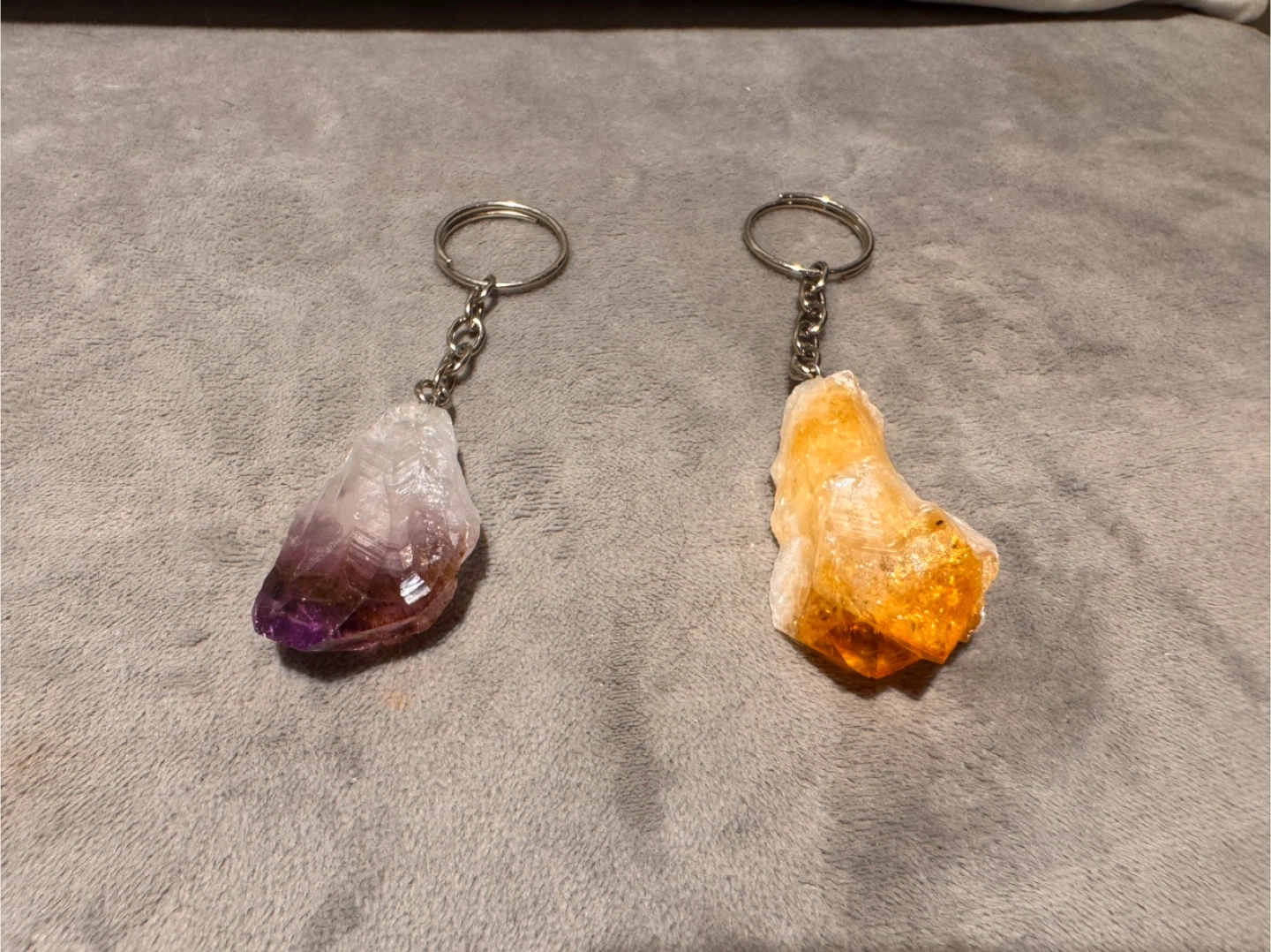 65Selling a couple of unique crystal keychains! One is amethyst (purple) and the other is citrine (orange/yellow). They're both in great condition and ready to add some sparkle to your keys or bag