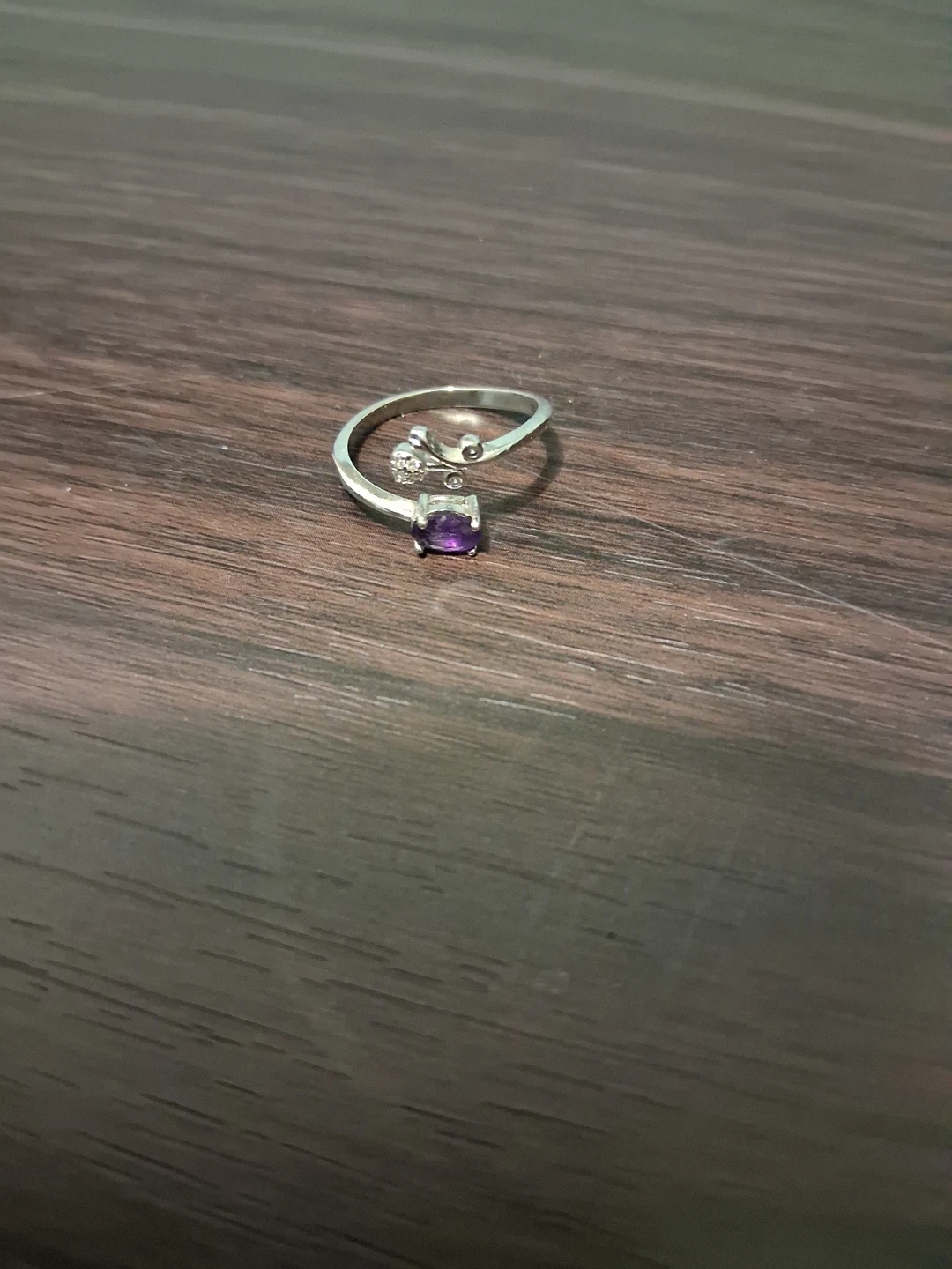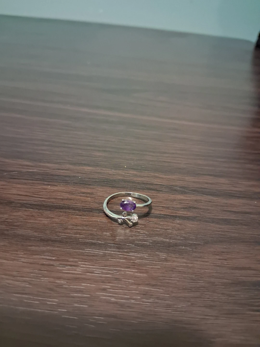 570Selling a lovely silver-tone ring with a purple amethyst gemstone and small clear stones on the side. It's in great condition and would make a beautiful addition to any jewelry collection