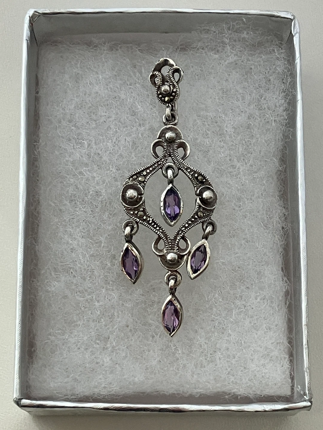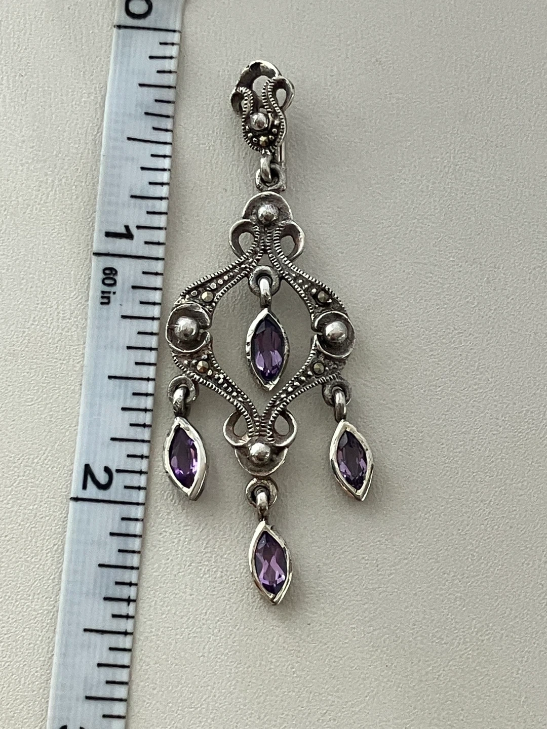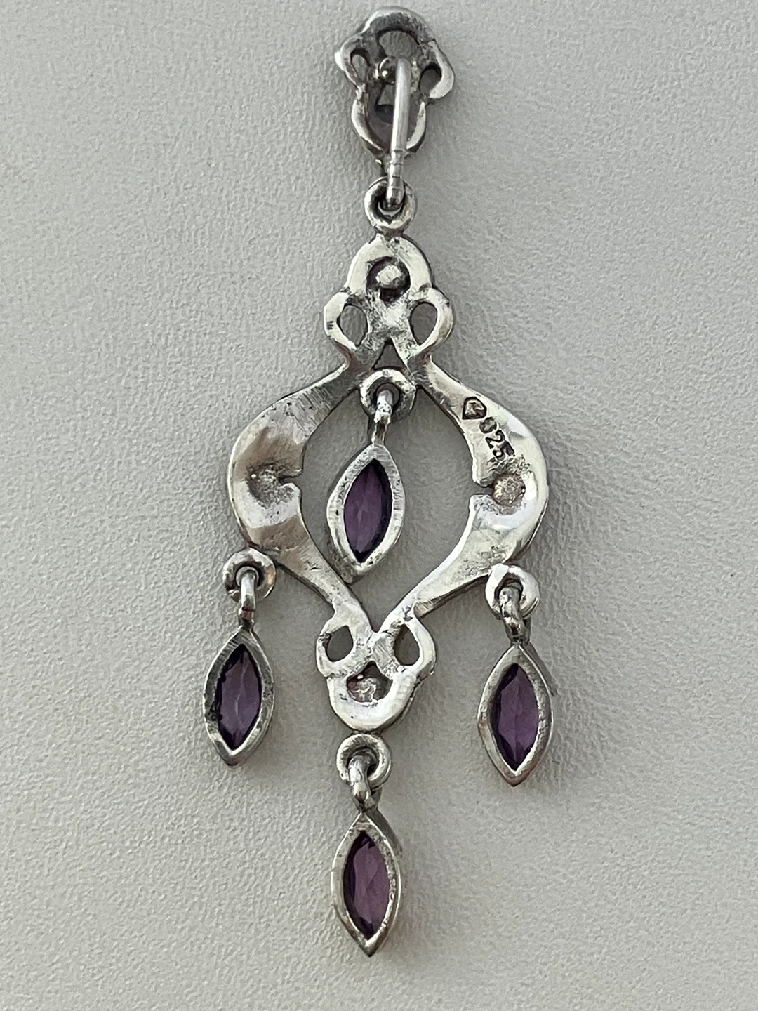 18925 sterling silver pendant featuring amethyst gem stones. It's in great condition and comes in a box for safekeeping. The pendant measures approximately 2 inches in length. A beautiful piece to add to your collection