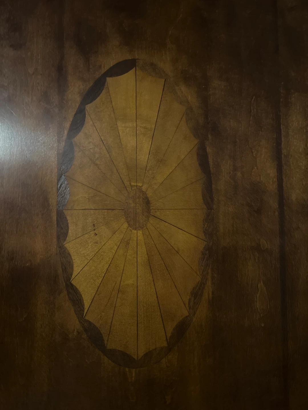• Decorative inlaid veneer tabletop with fan/medallion pattern