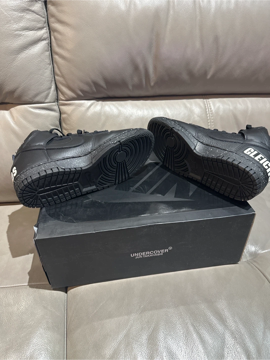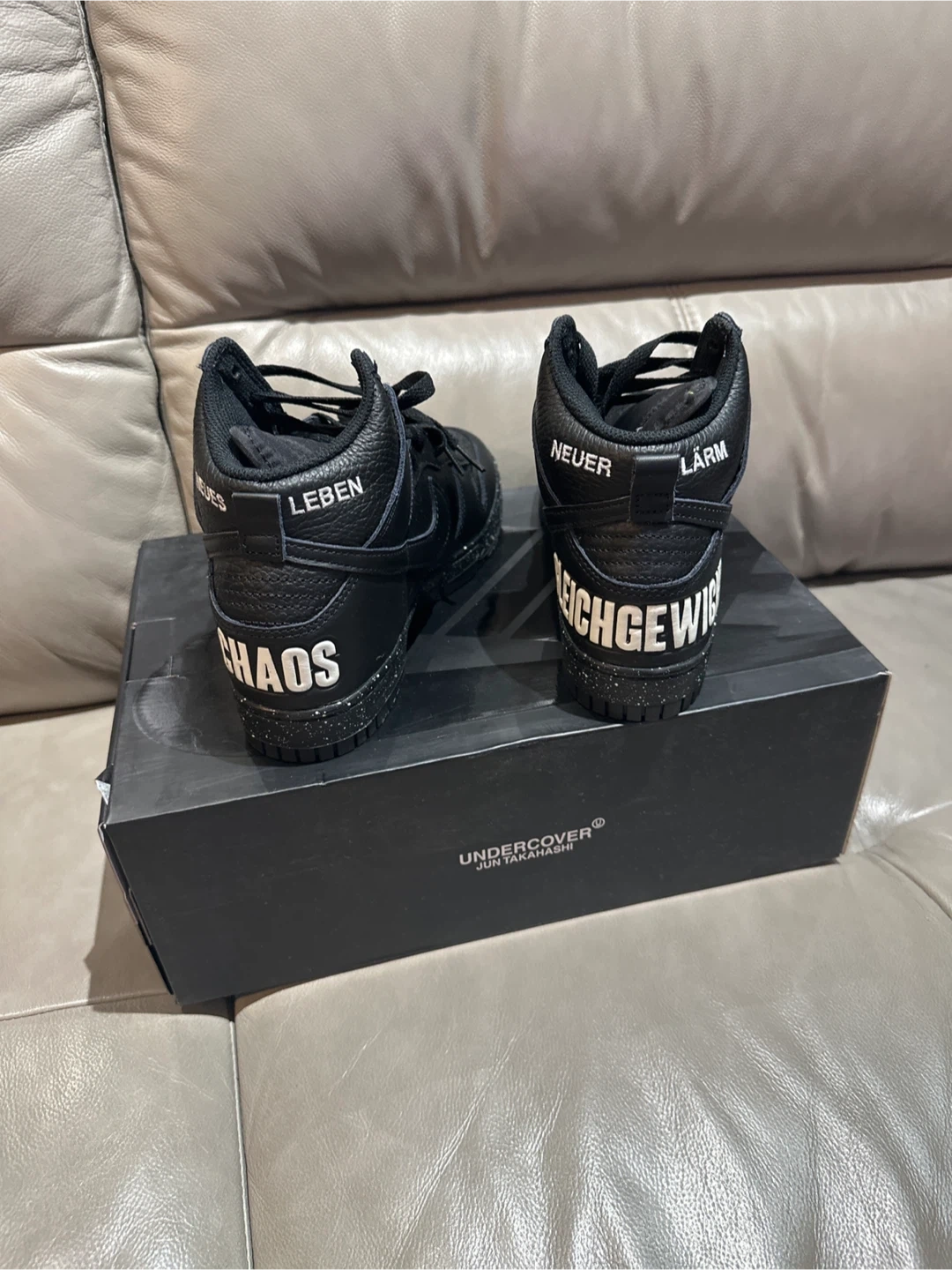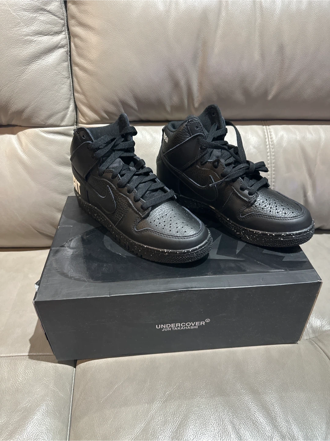 Black Nike Dunk High 1985 edition sneakers . Includes original Undercover "Chaos" box. Men's sizes 6 / womans 7.5