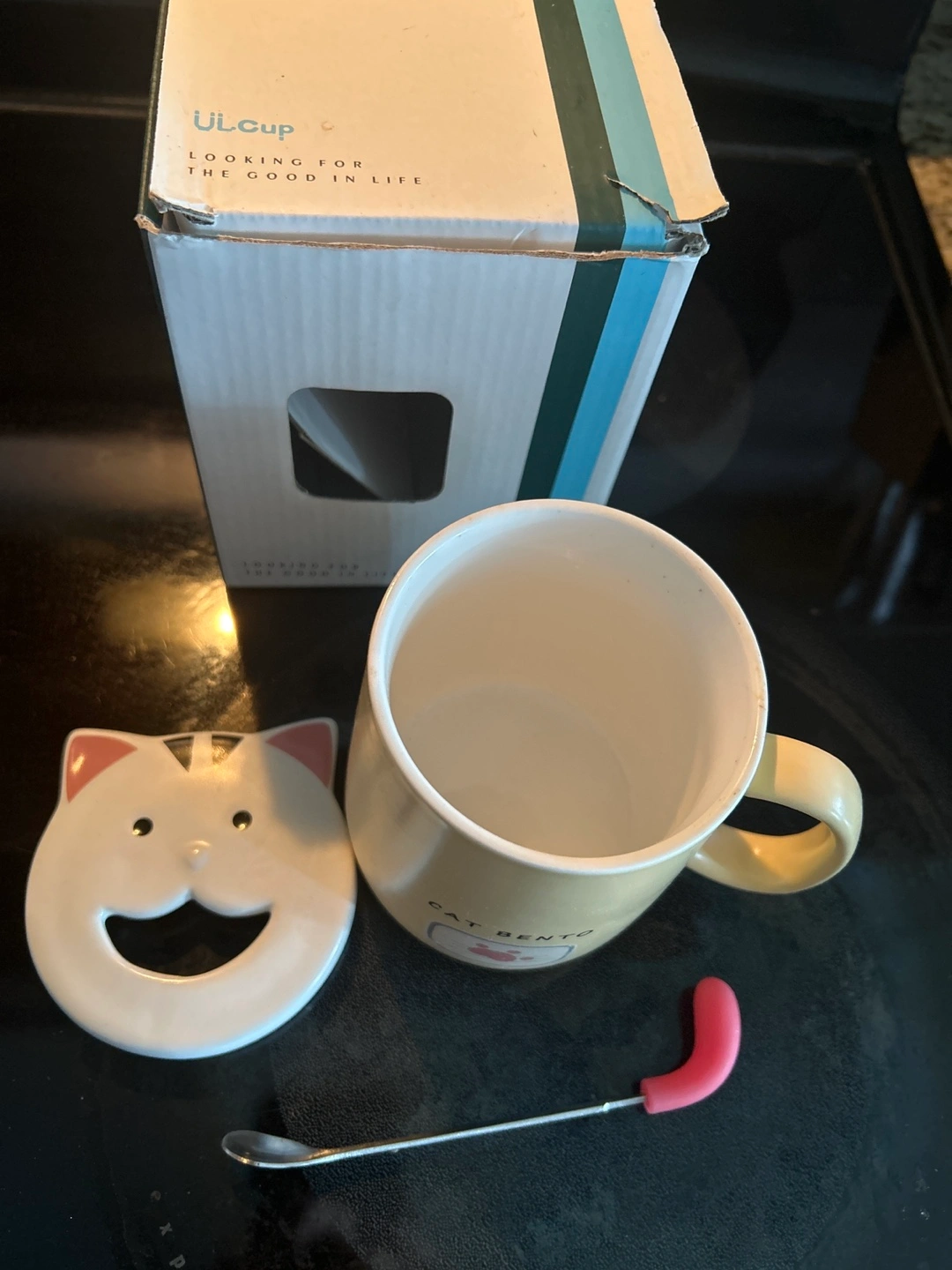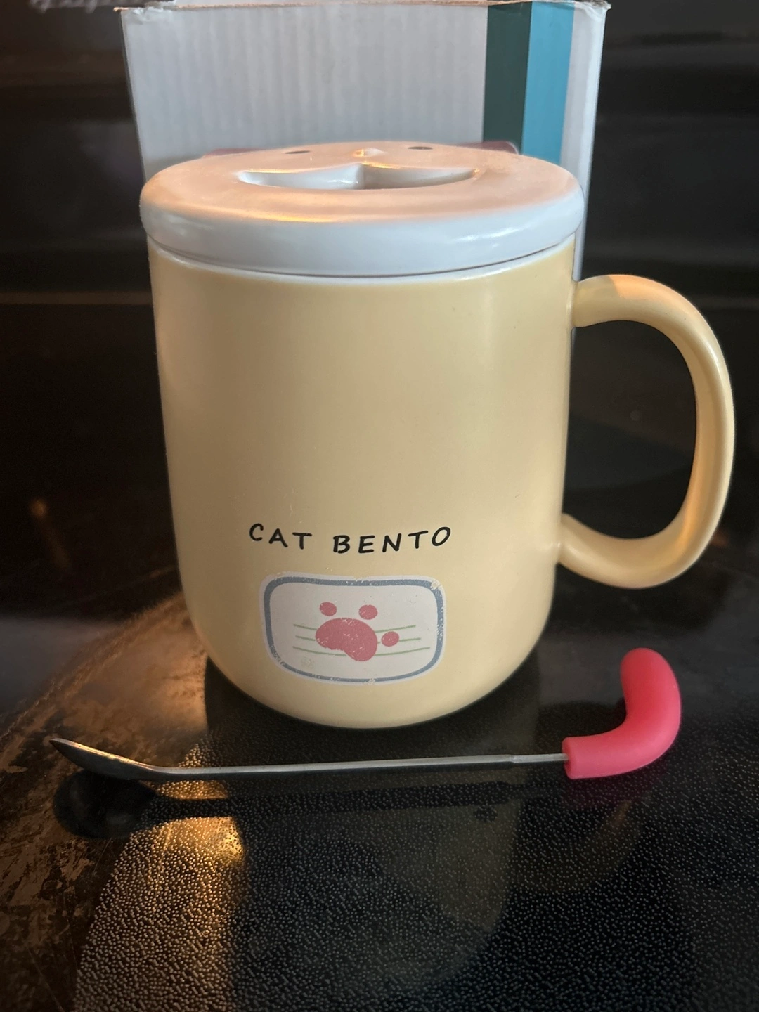 Here's a cute ULCup Cat Bento mug! It comes with a matching cat-themed lid and a small spoon, perfect for stirring your tea or coffee. The mug is a lovely soft yellow colour and the box is included too