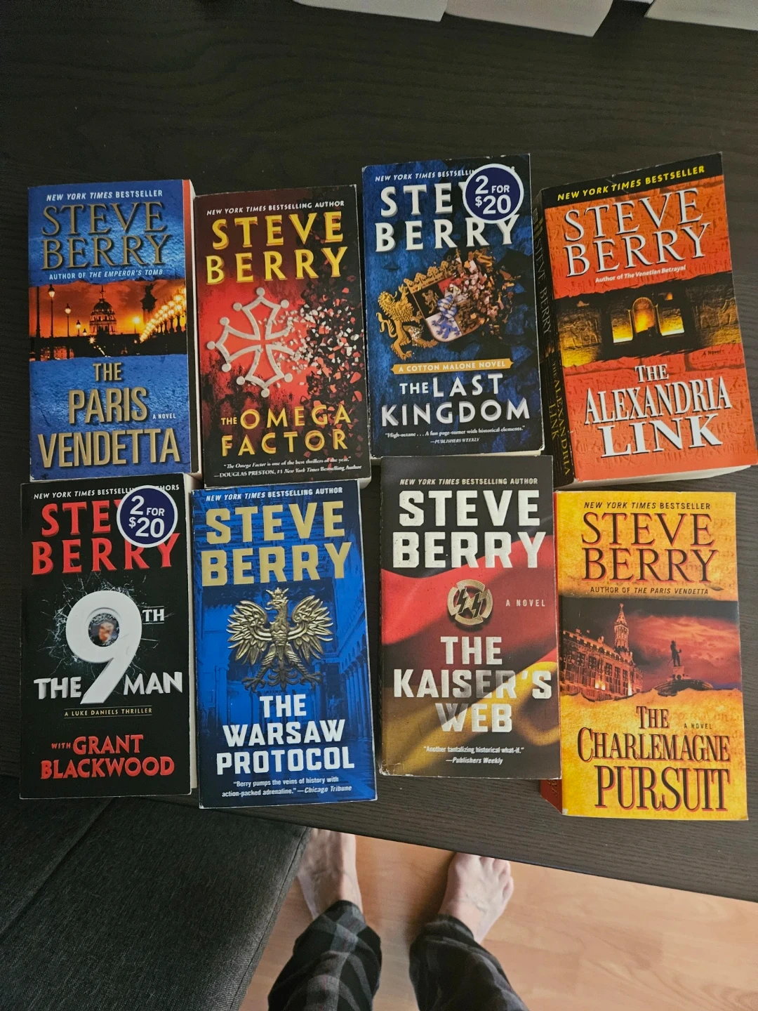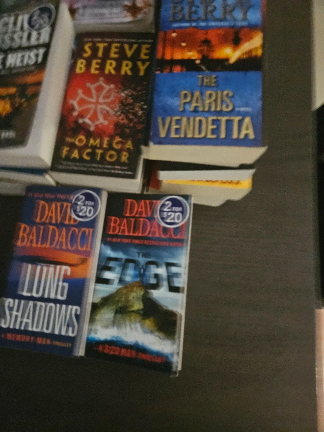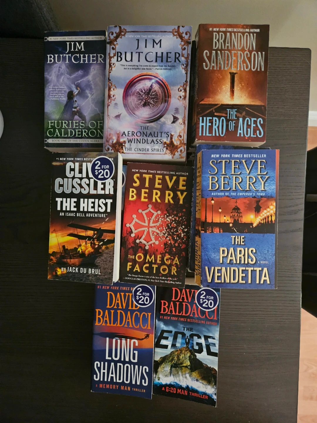 Includes titles by Jim Butcher, Brandon Sanderson, Steve Berry, Clive Cussler, and David Baldacci. All books appear to be in excellent condition, perfect for any avid reader or collector.