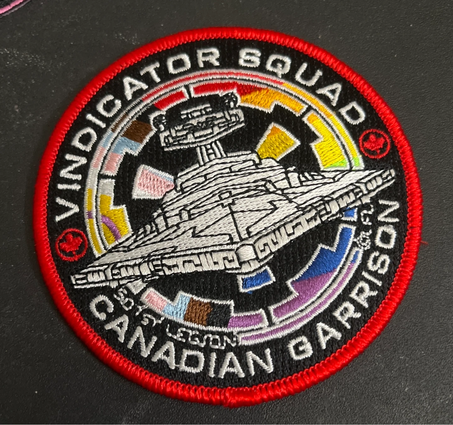Embroidered patch for Vindicator Squad, Canadian Garrison. Features a Star Destroyer design with colourful accents. Includes "2019 Lemon" text.