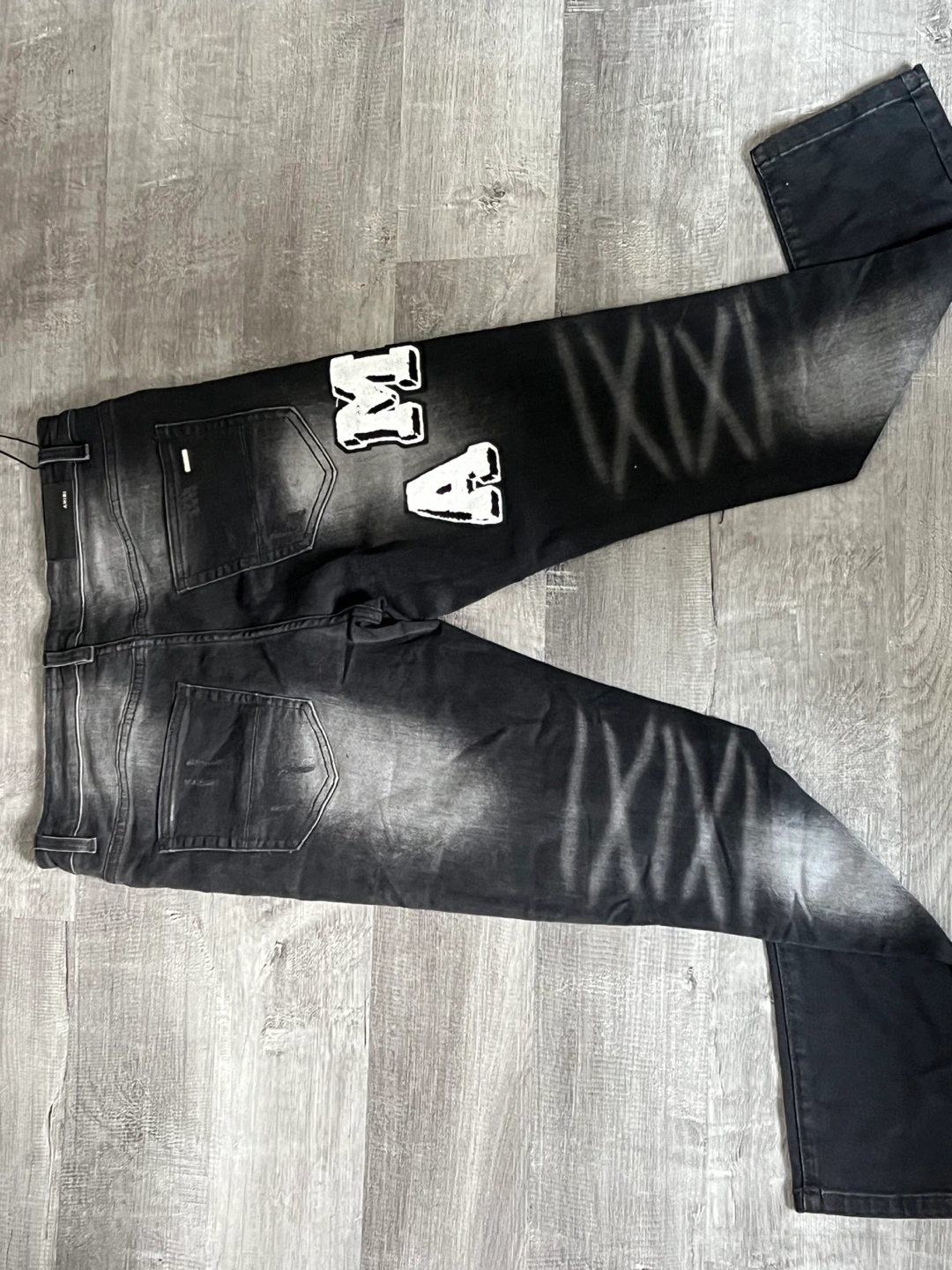 Selling a pair of Amiri jeans in distressed black denim. They have a unique design and are in great condition.