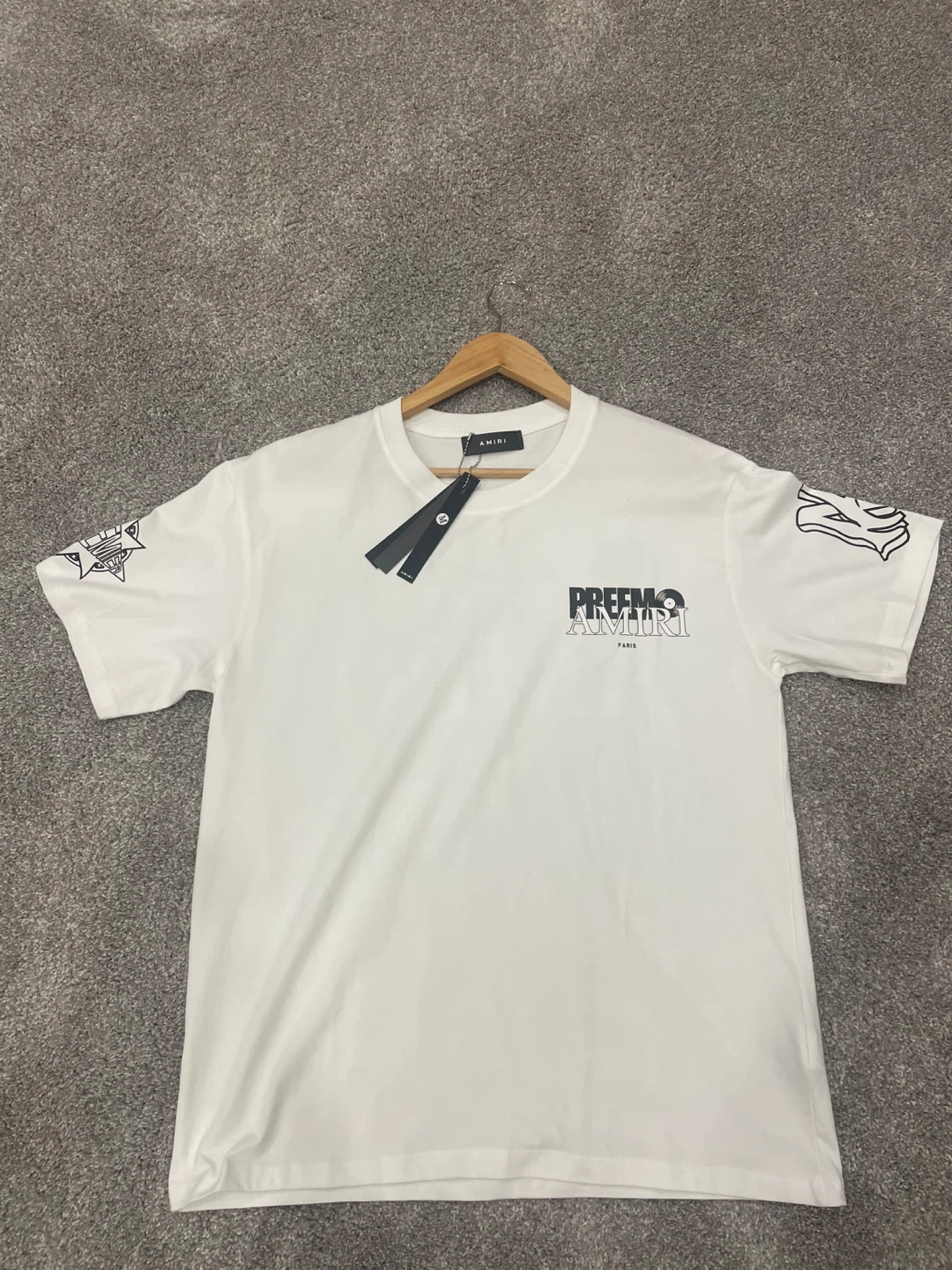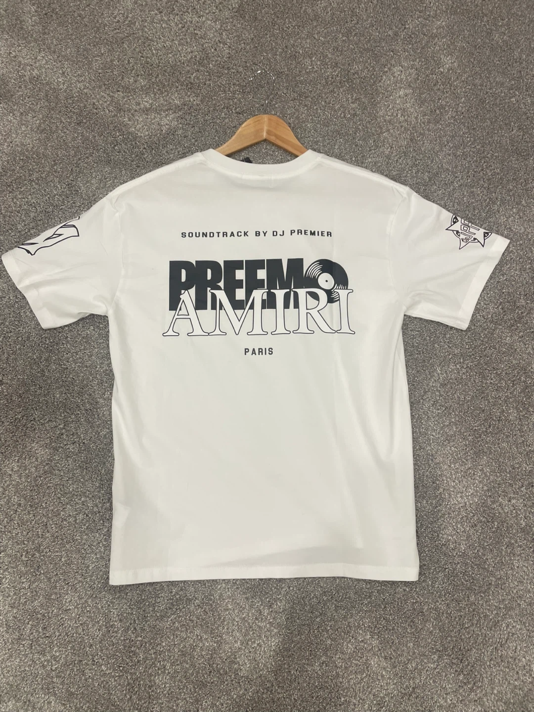 Selling a white Amiri Preemo T-shirt in size medium! The shirt features a unique design with 'SOUNDTRACK BY DJ PREMIER' and 'PREEMO AMIRI PARIS' printed on the back. It's in great condition, brand new never worn