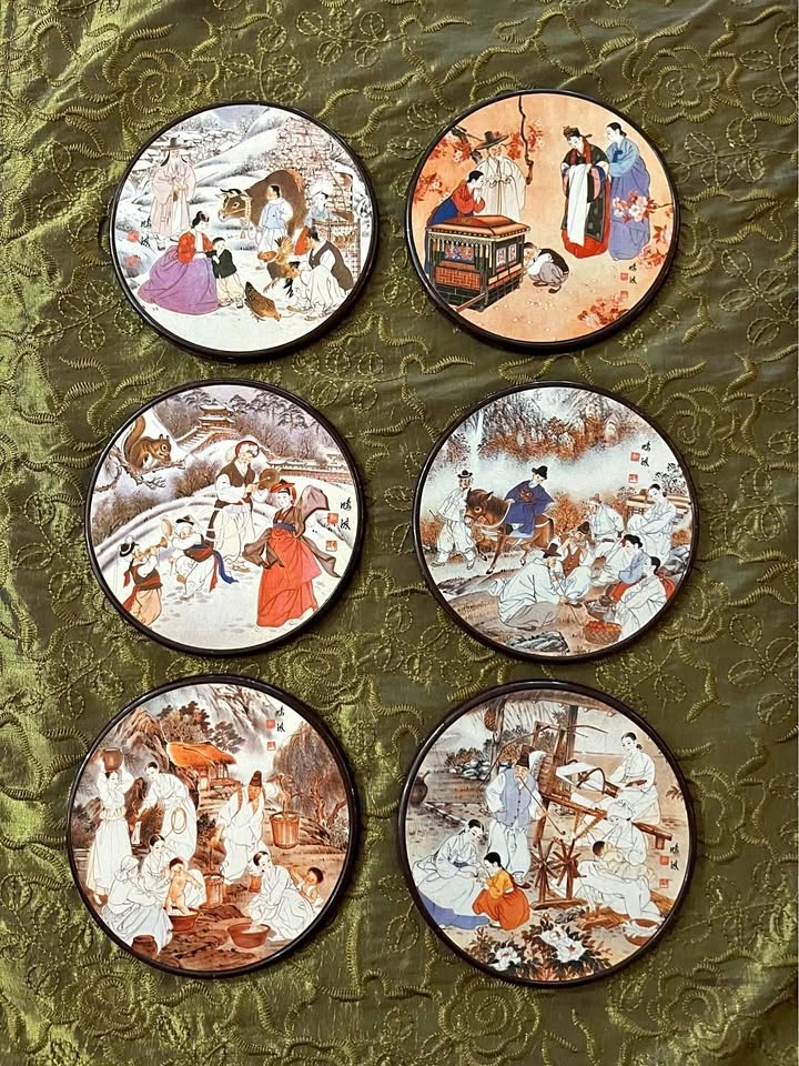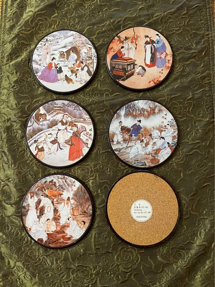 Beautiful set of round coasters featuring classic Korean scenes inspired by artist Kim Hong-do (1745β1806).