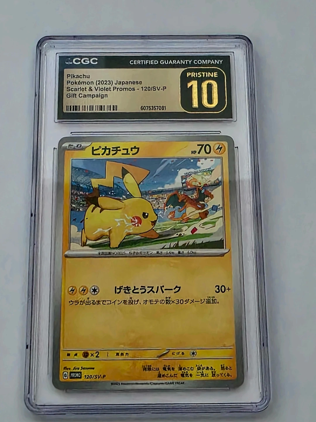 Japanese Pokémon Pikachu card from the Scarlet & Violet Promos set, part of the 120/SV-P Gift Campaign. Graded Pristine 10 by CGC. This card features Pikachu in a stadium setting.