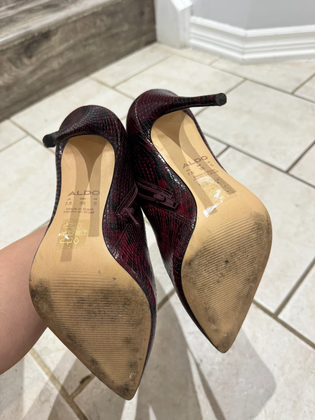 Stylish ALDO boots with a faux snake print pattern. Feature a pointed toe and side zipper. Heel height is approximately 4 inches.