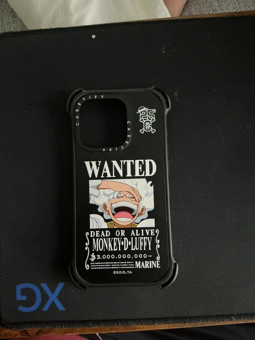 This Casetify iPhone case features a "Wanted" poster design for Monkey D. Luffy. It's a black case with graphics from the popular anime. It fits an iPhone.