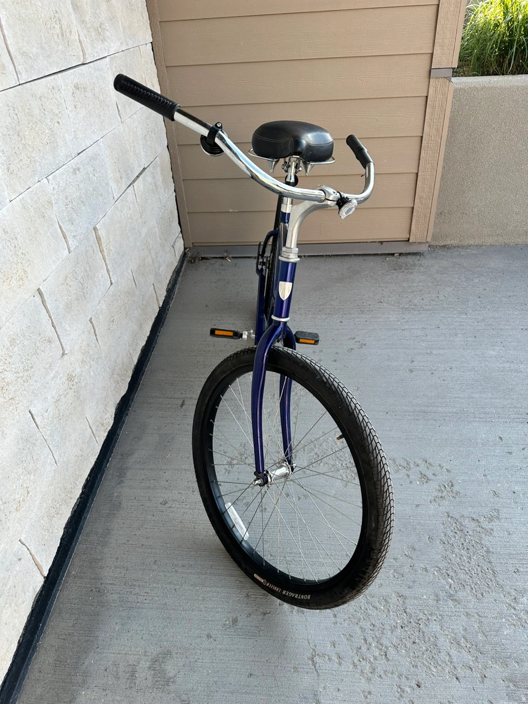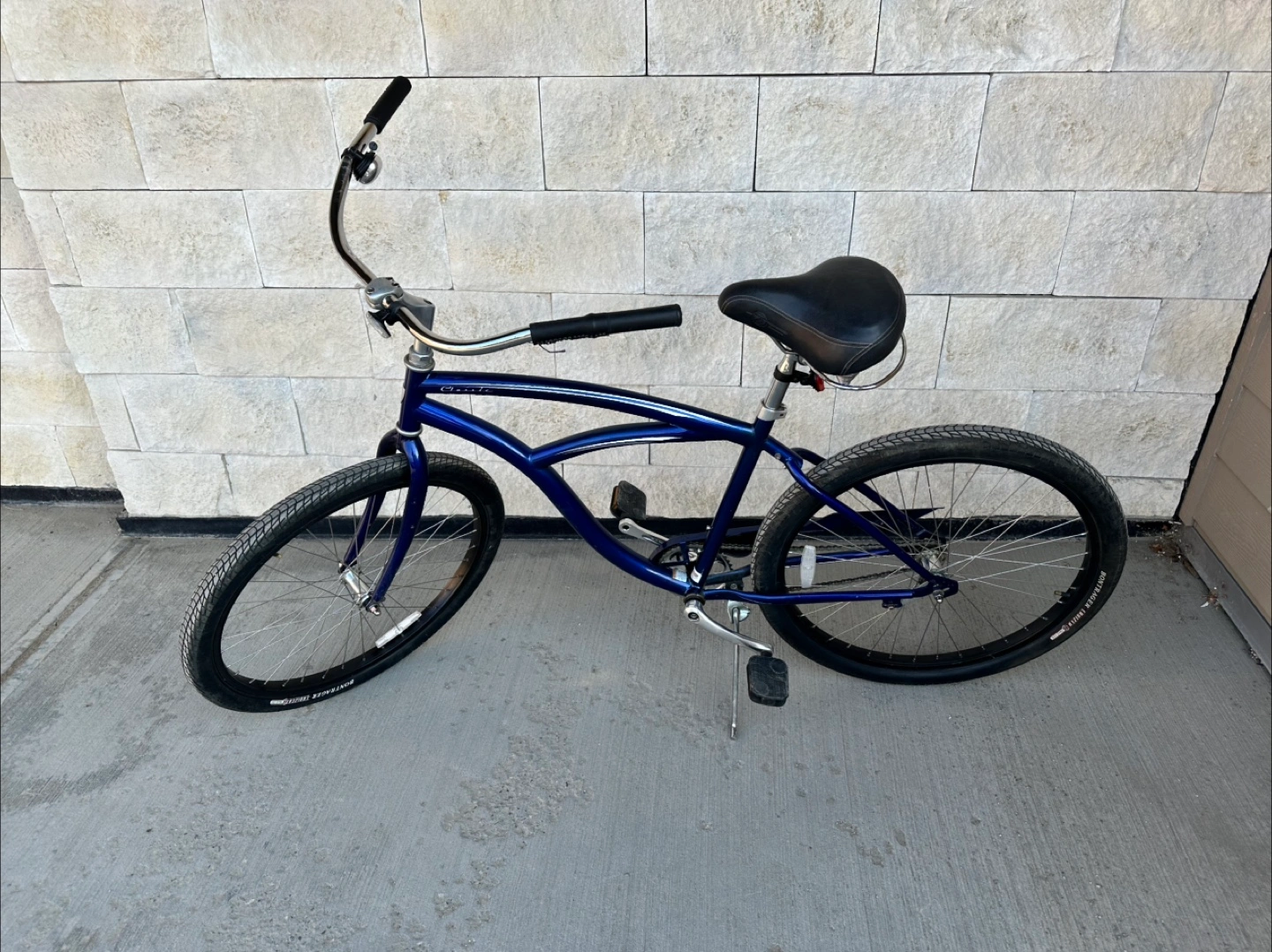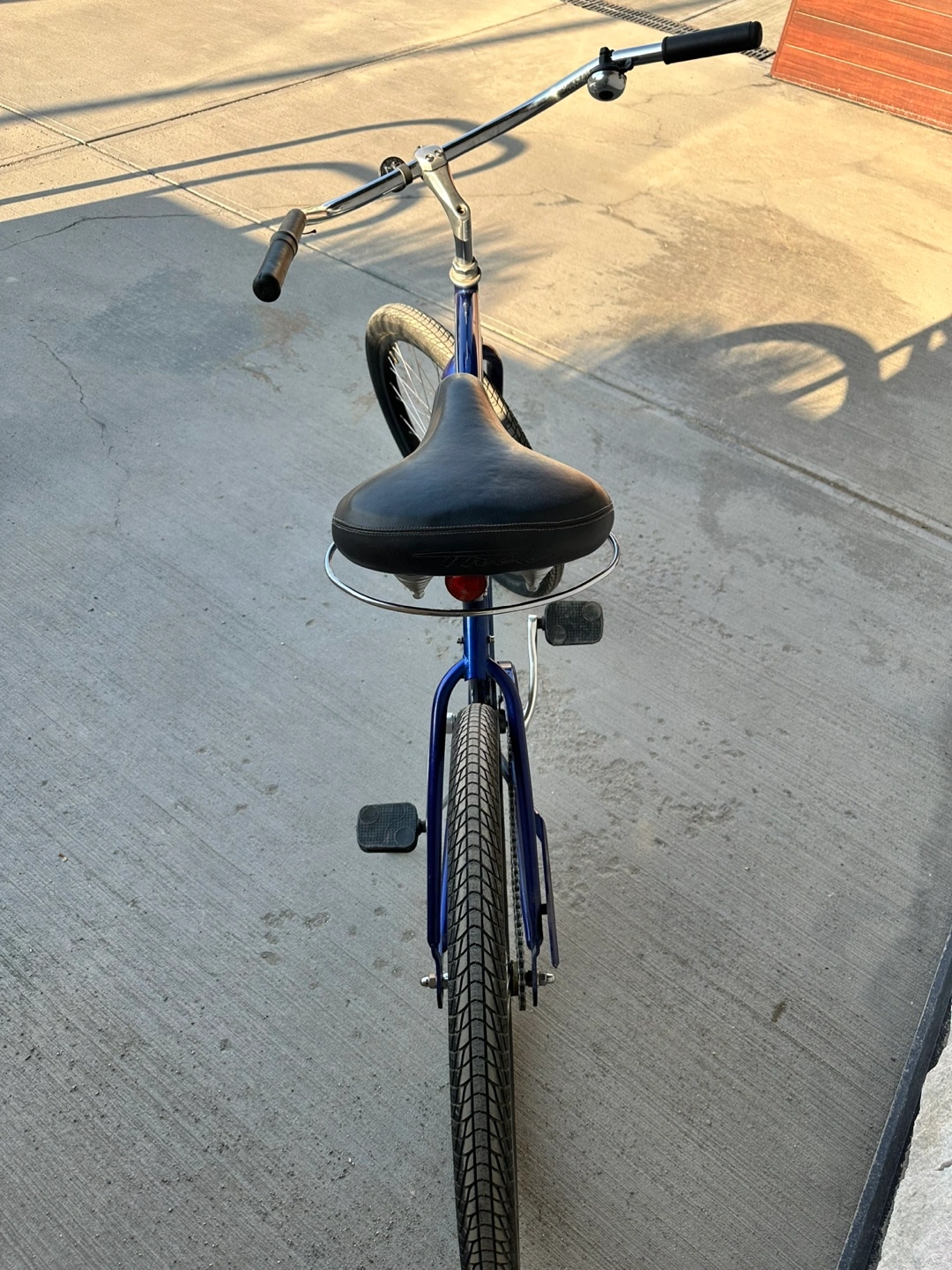 Navy blue cruiser bike. Features a comfortable seat and tall handlebars. A great way to enjoy a leisurely ride on a sunny day.