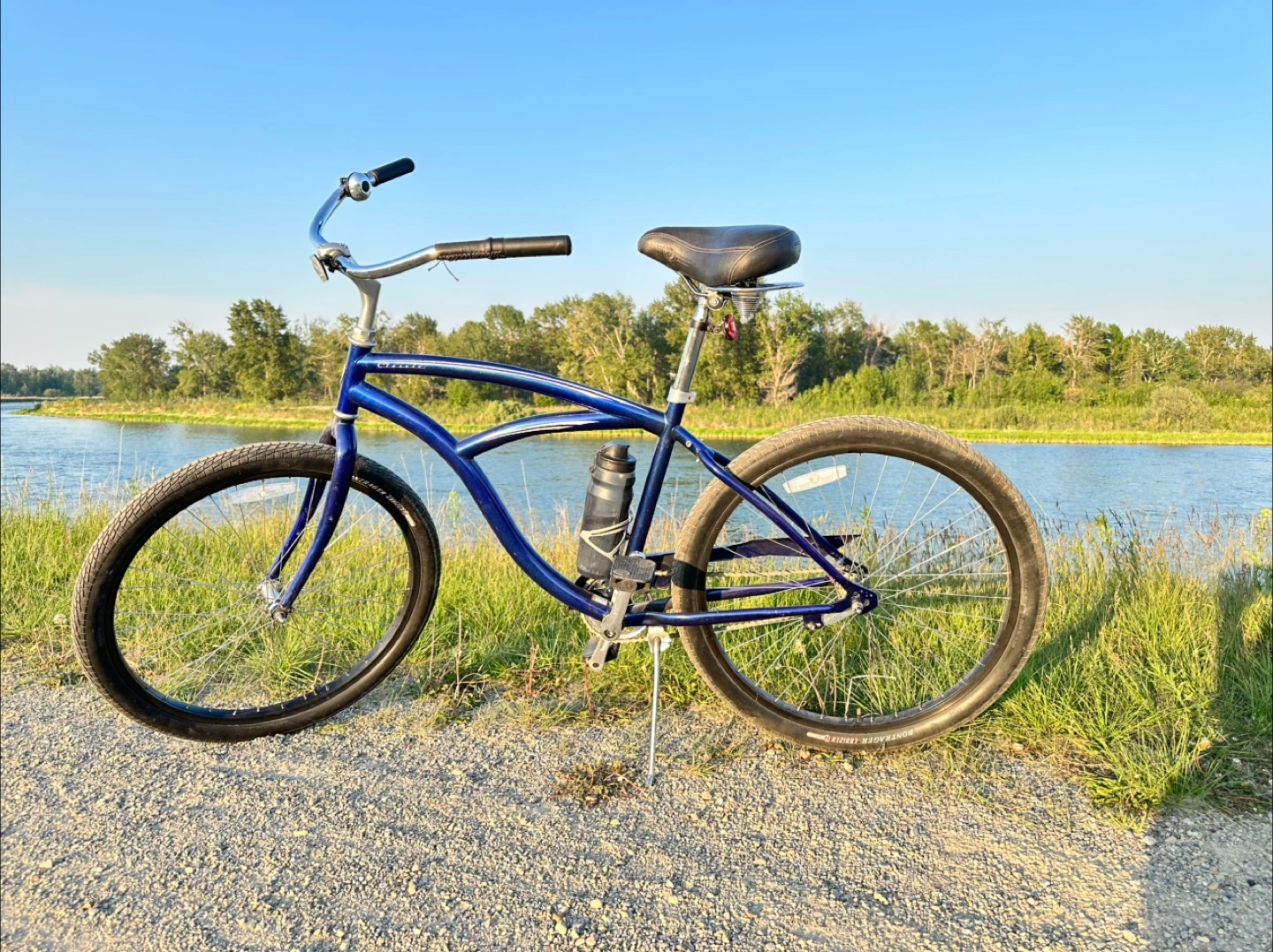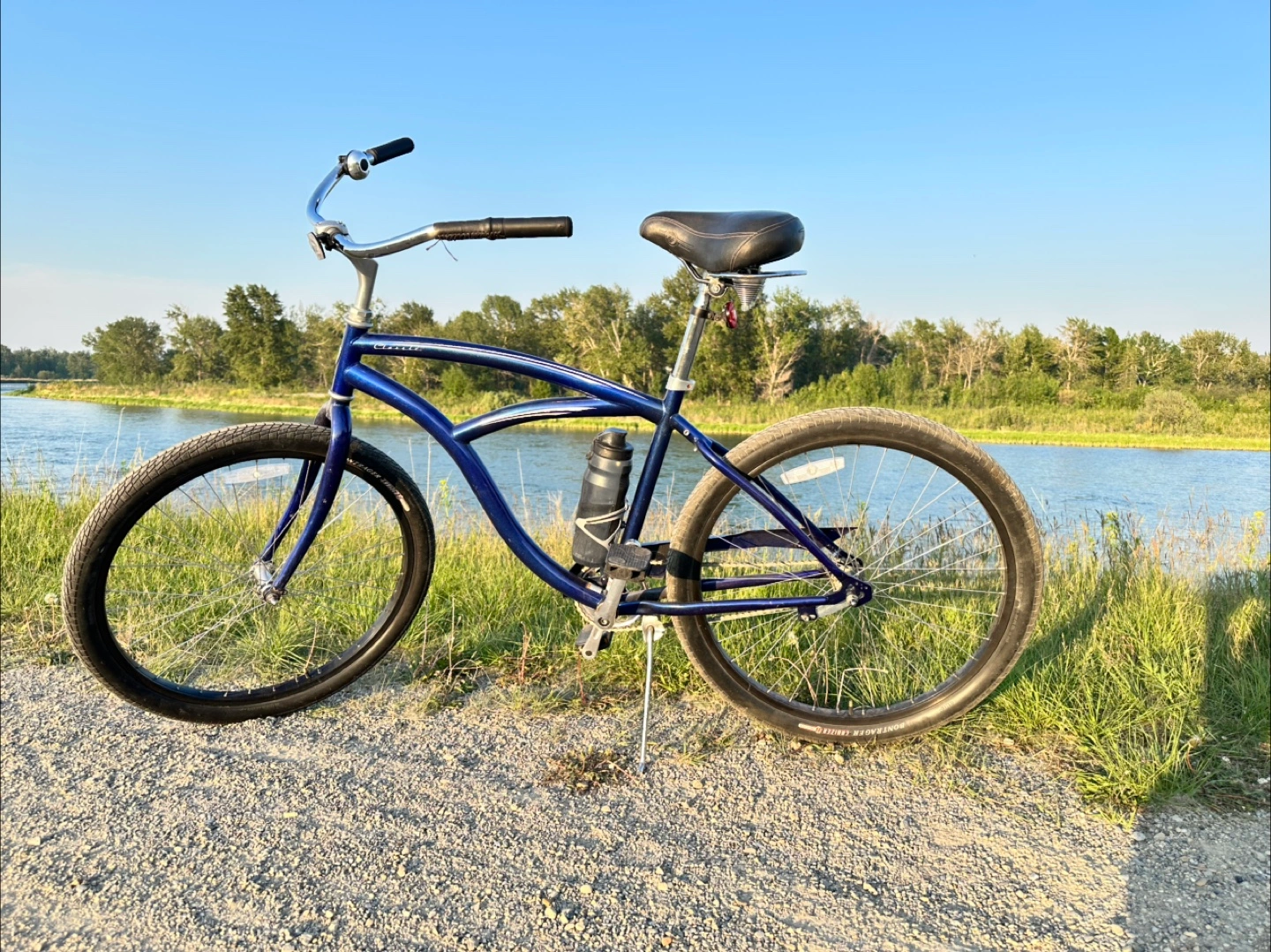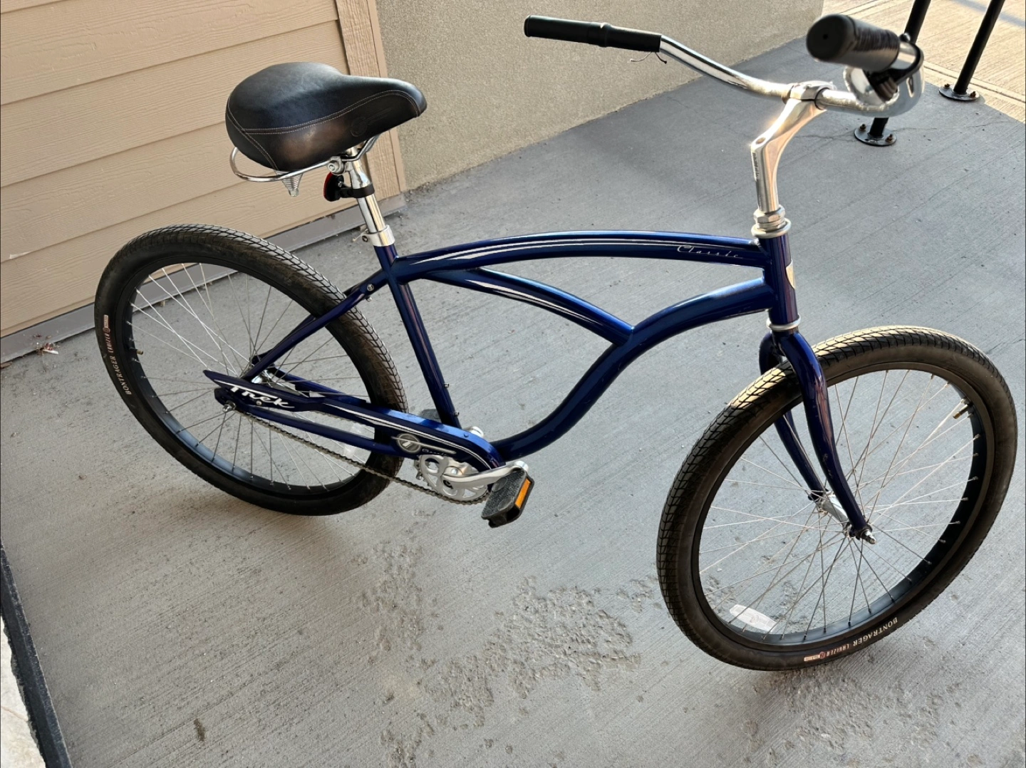 Navy blue cruiser bike. Features a comfortable seat and tall handlebars. A great way to enjoy a leisurely ride on a sunny day.