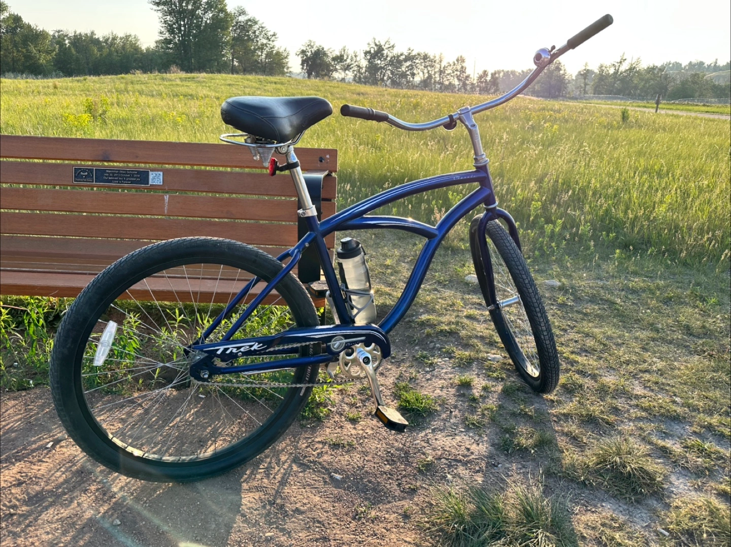 Navy blue cruiser bike. Features a comfortable seat and tall handlebars. A great way to enjoy a leisurely ride on a sunny day.