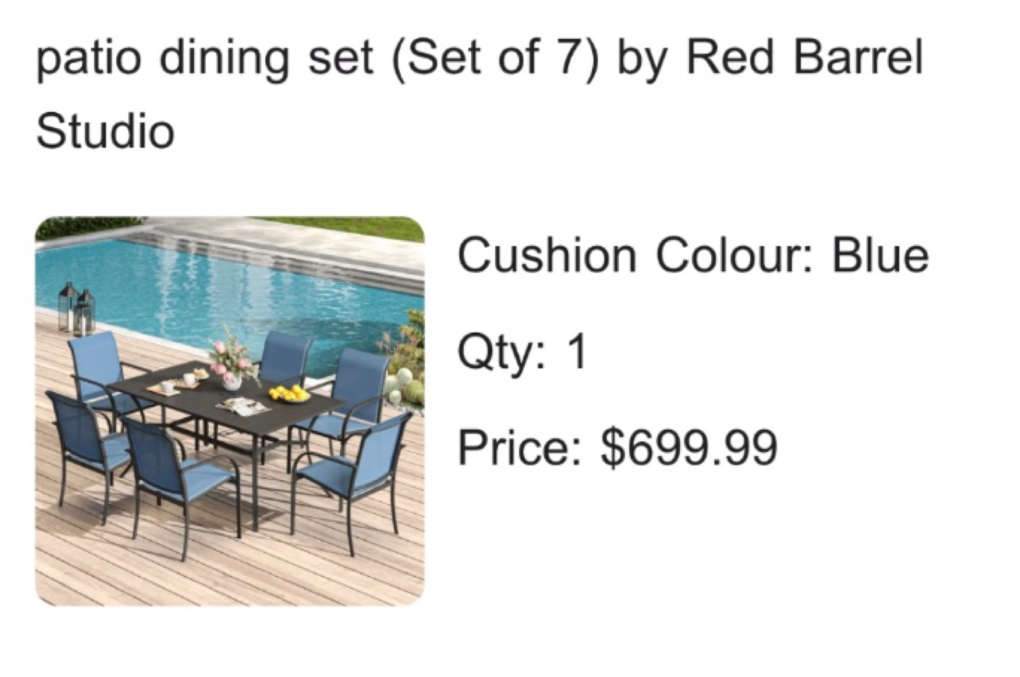 Seven-piece patio dining set. Black metal frame. Blue cushions. Rectangular table. Six chairs.