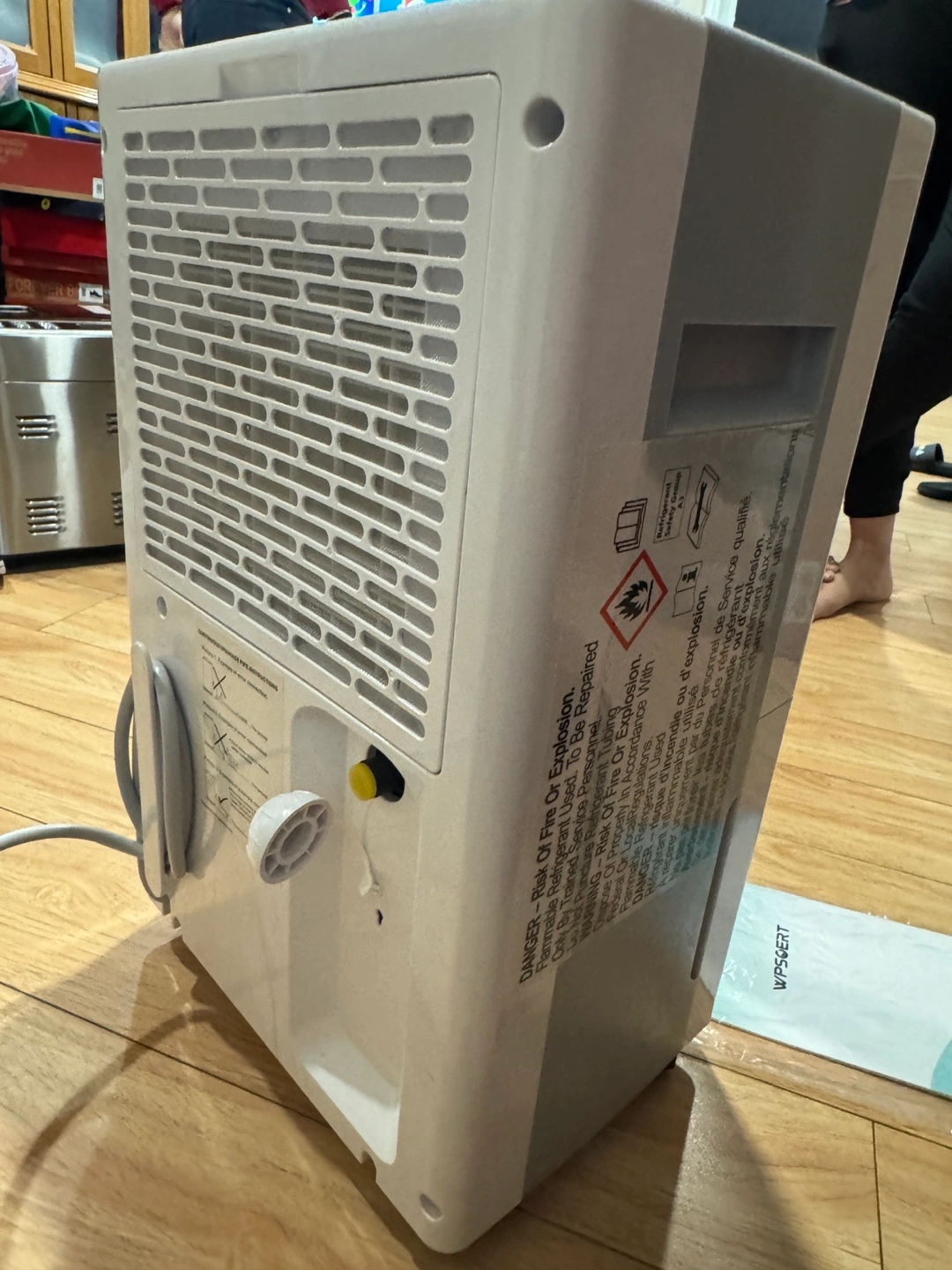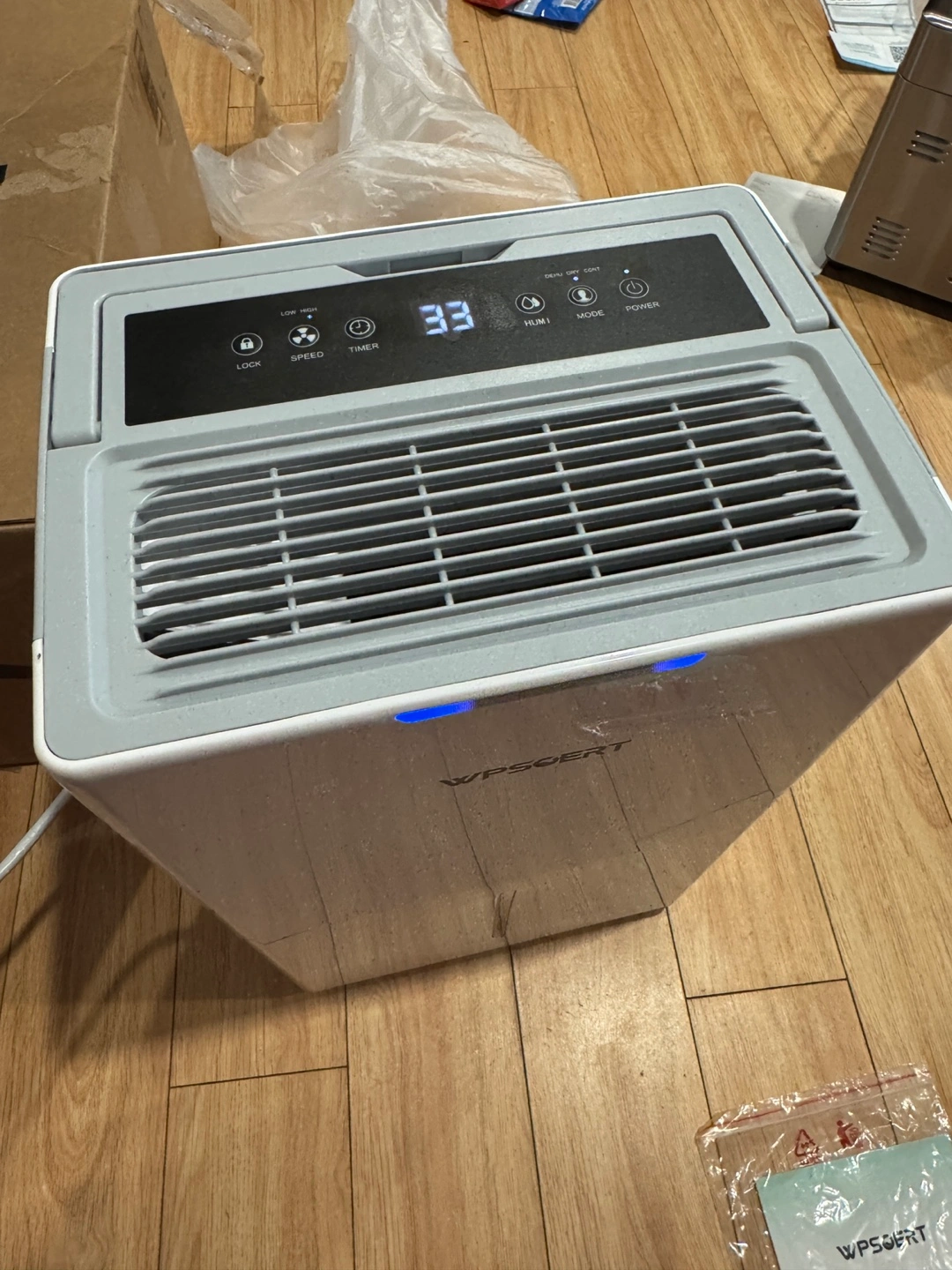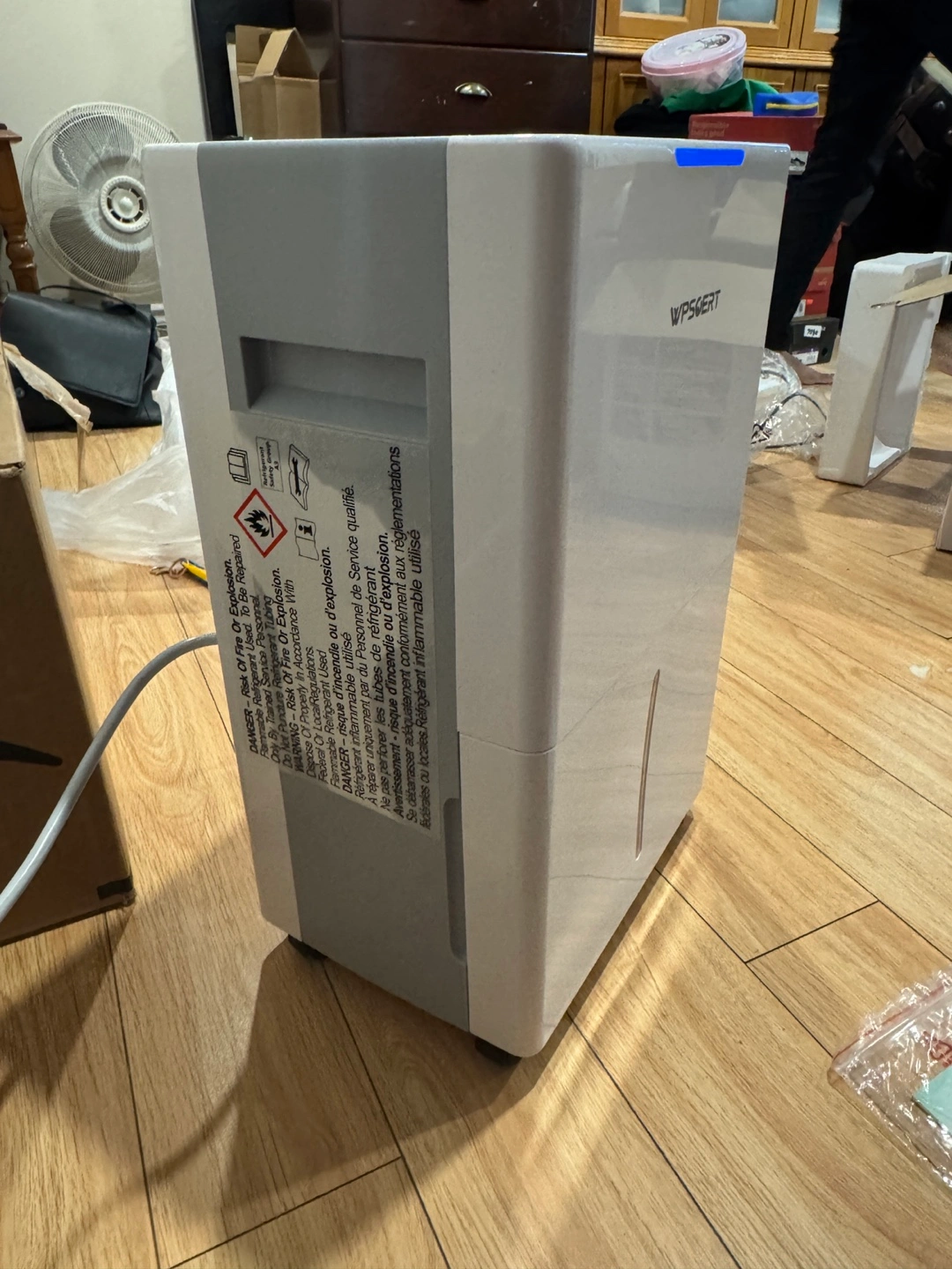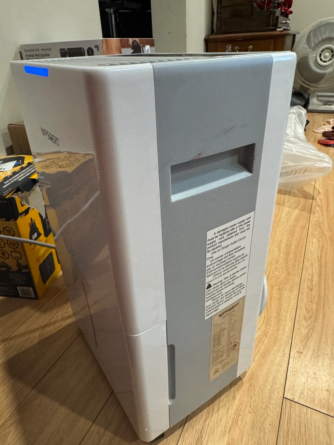 New WPSCERT dehumidifier. Digital display, multiple settings, and drainage hose included. Compact and efficient design. Excellent for basements or small spaces.