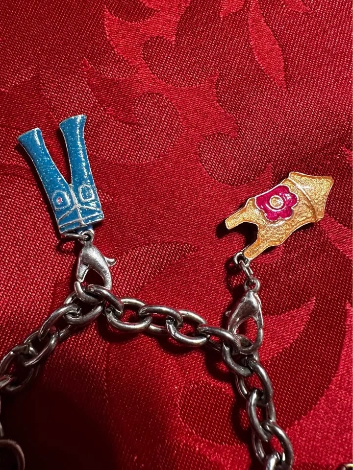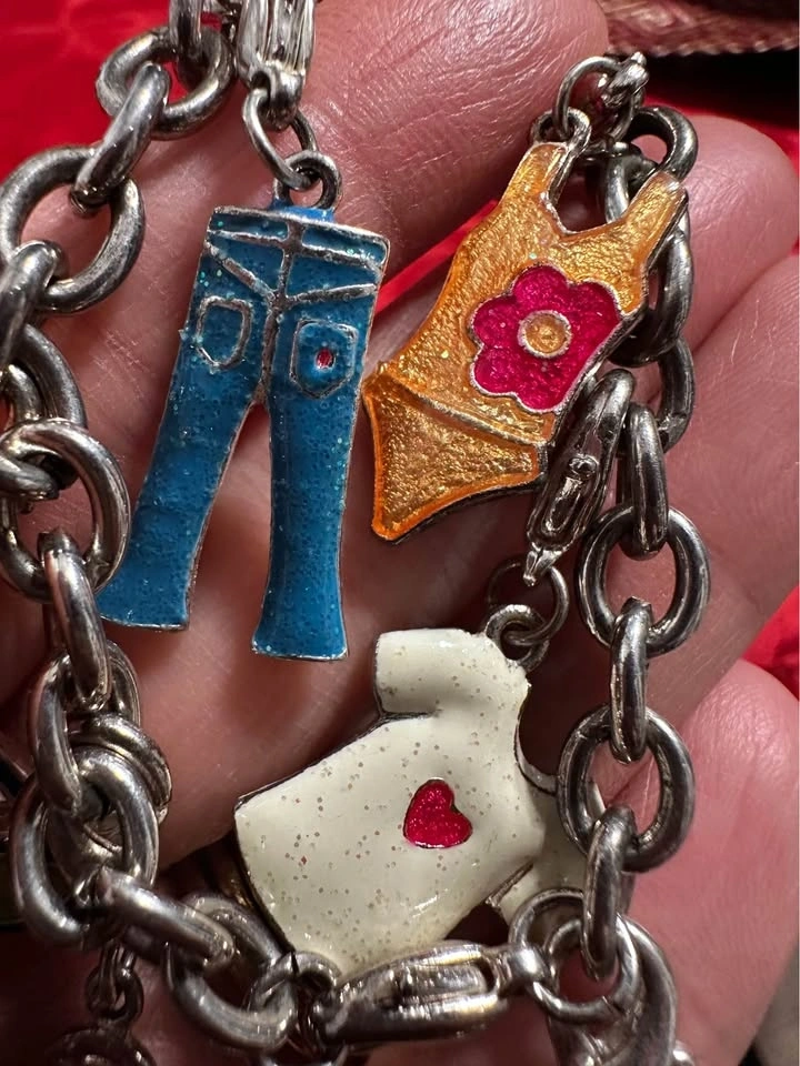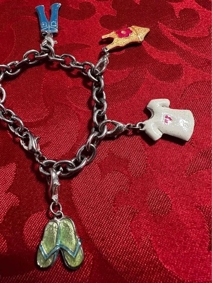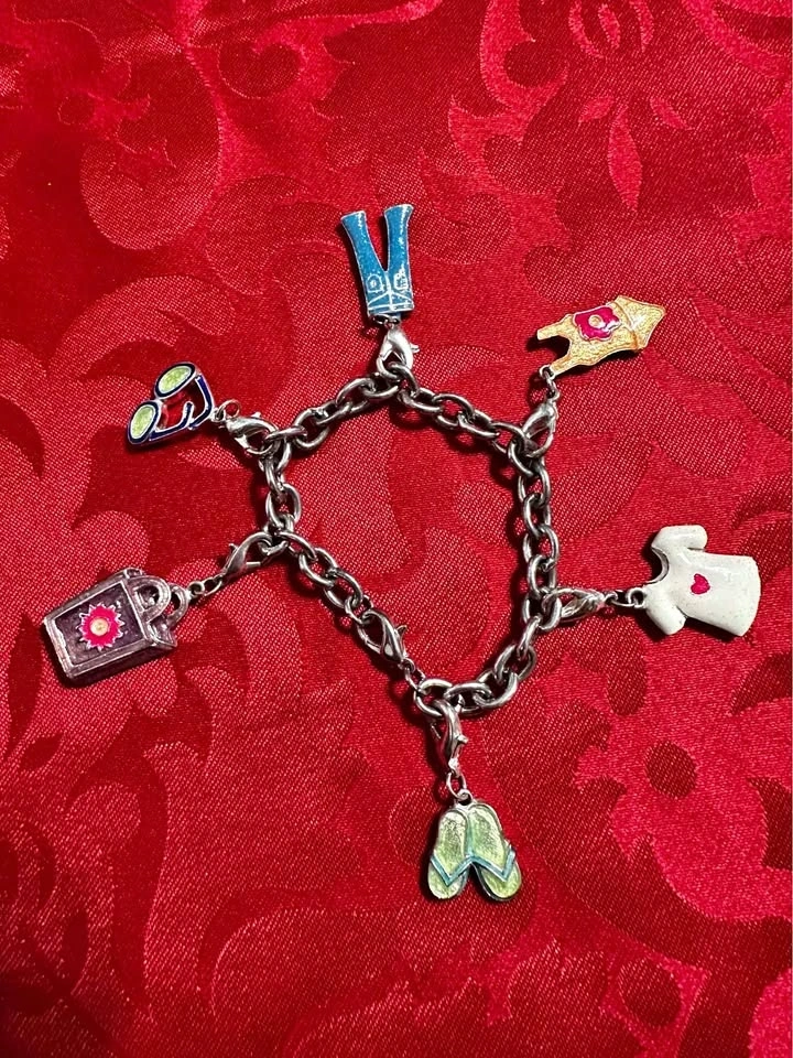 Colorful charm bracelet! Has a bunch of super cute charms attached. There is a pair of blue jeans, a gold hand with a red flower, a white t-shirt with a pink heart, green flip-flops, a purple bag with a pink flower, and green sunglasses. Perfect for adding a fun touch to any outfit. Pickup only in Coquitlam, Westwood Plateau, behind IGA.