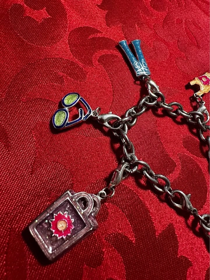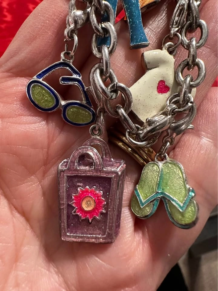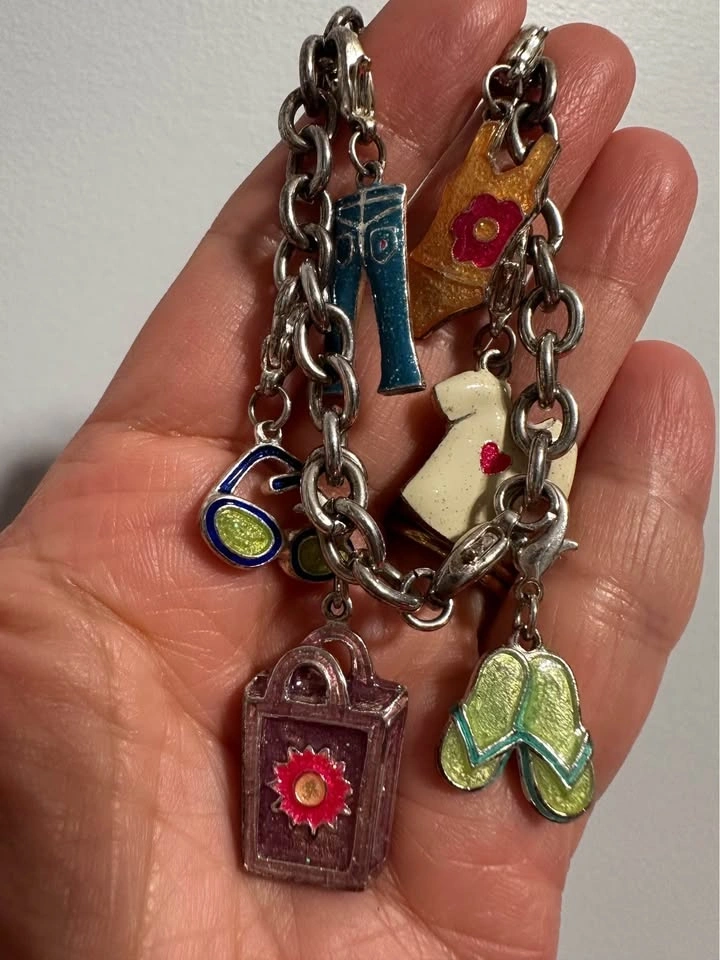 Colorful charm bracelet! Has a bunch of super cute charms attached. There is a pair of blue jeans, a gold hand with a red flower, a white t-shirt with a pink heart, green flip-flops, a purple bag with a pink flower, and green sunglasses. Perfect for adding a fun touch to any outfit. Pickup only in Coquitlam, Westwood Plateau, behind IGA.