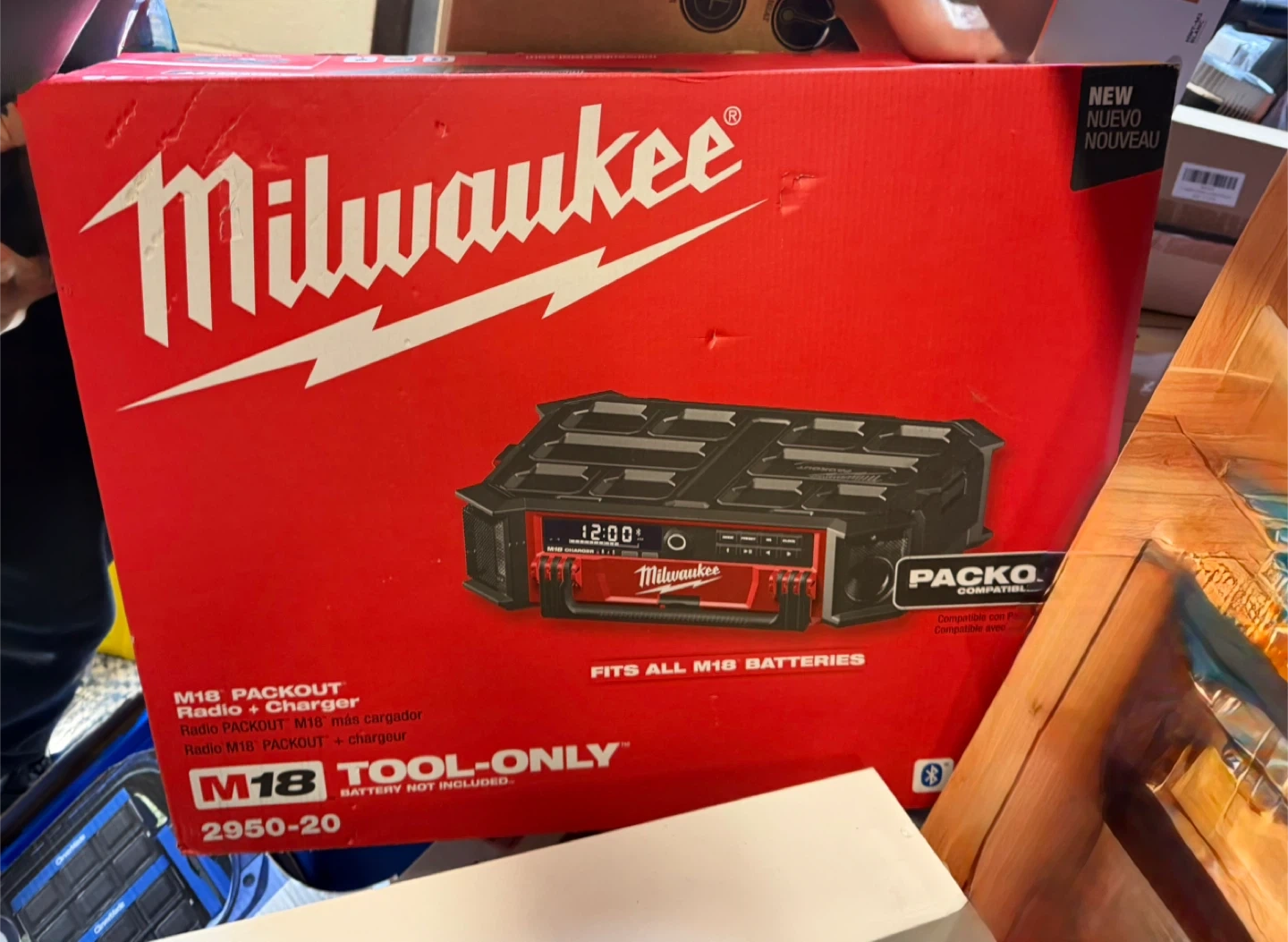 This is a Milwaukee M18 PACKOUT radio and charger combo. It's a tool-only unit, meaning the battery is not included. It's compatible with all M18 batteries and fits into the PACKOUT system. This would be useful for job sites or outdoor work where you need both tunes and power.