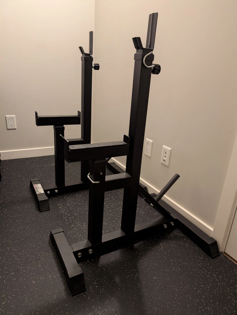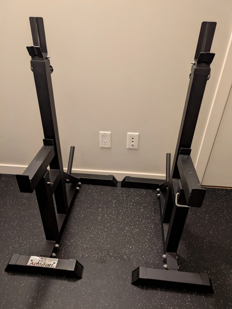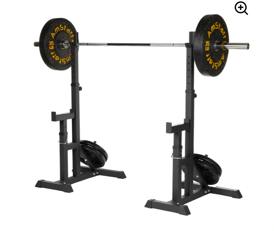 67Selling a pair of Amstaff squat stands in black. They're in great shape and ready for your home gym setup! These stands are perfect for squats and bench presses. - 5" back plate to catch bar as lifter maneuvers back to stand. - 2.5" mouth opening for bar support - Fully adjustable 10" long safeties - Bar Holders height range of 34" to 60" - Storage Pegs for plate storage and stability. - Recommended Weight 400lbs.