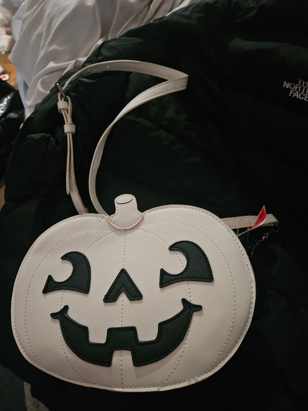 Fun white pumpkin shaped crossbody bag. Faux leather material. Perfect for Halloween events or themed parties!