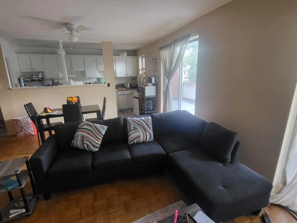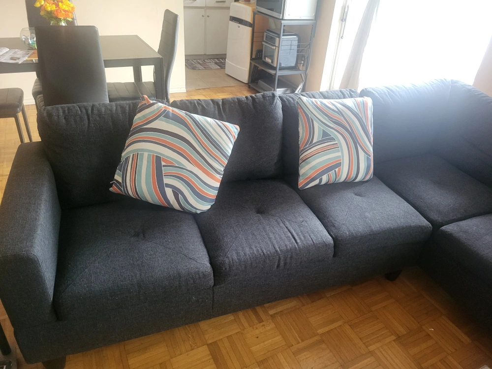 Selling a comfy dark grey sectional sofa! It's in great shape and perfect for lounging. The cushions are nice and plush, and it's a great size for a living room.