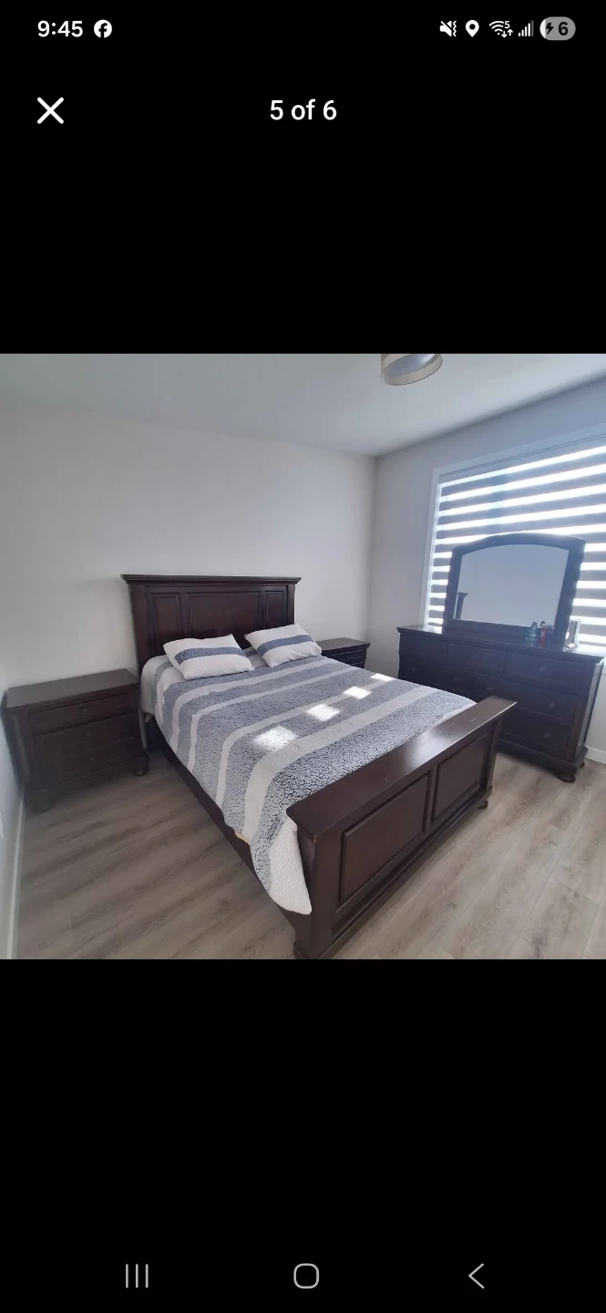 This is a dark wood bedroom set, perfect for creating a warm and inviting atmosphere. It includes a queen-size bed frame, a dresser with a mirror, and two nightstands. The wood finish is rich and deep, complementing most decor styles. This set provides ample storage and a complete look for any bedroom.