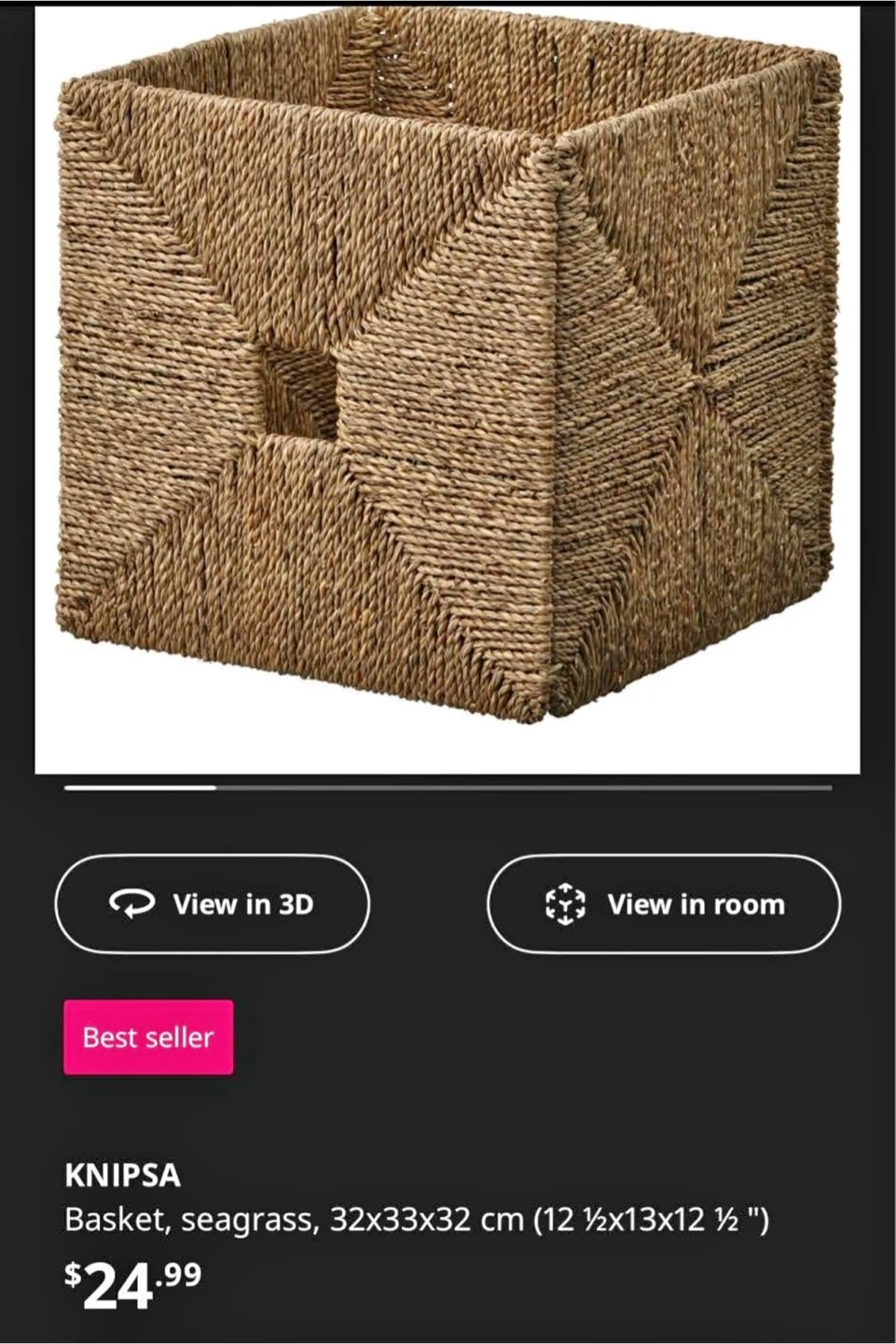 Set of three IKEA KNIPSA baskets made from seagrass. Dimensions are 32x33x32 cm (12 ½x13x12 ½"). They're great for organizing shelves or any space in your home!