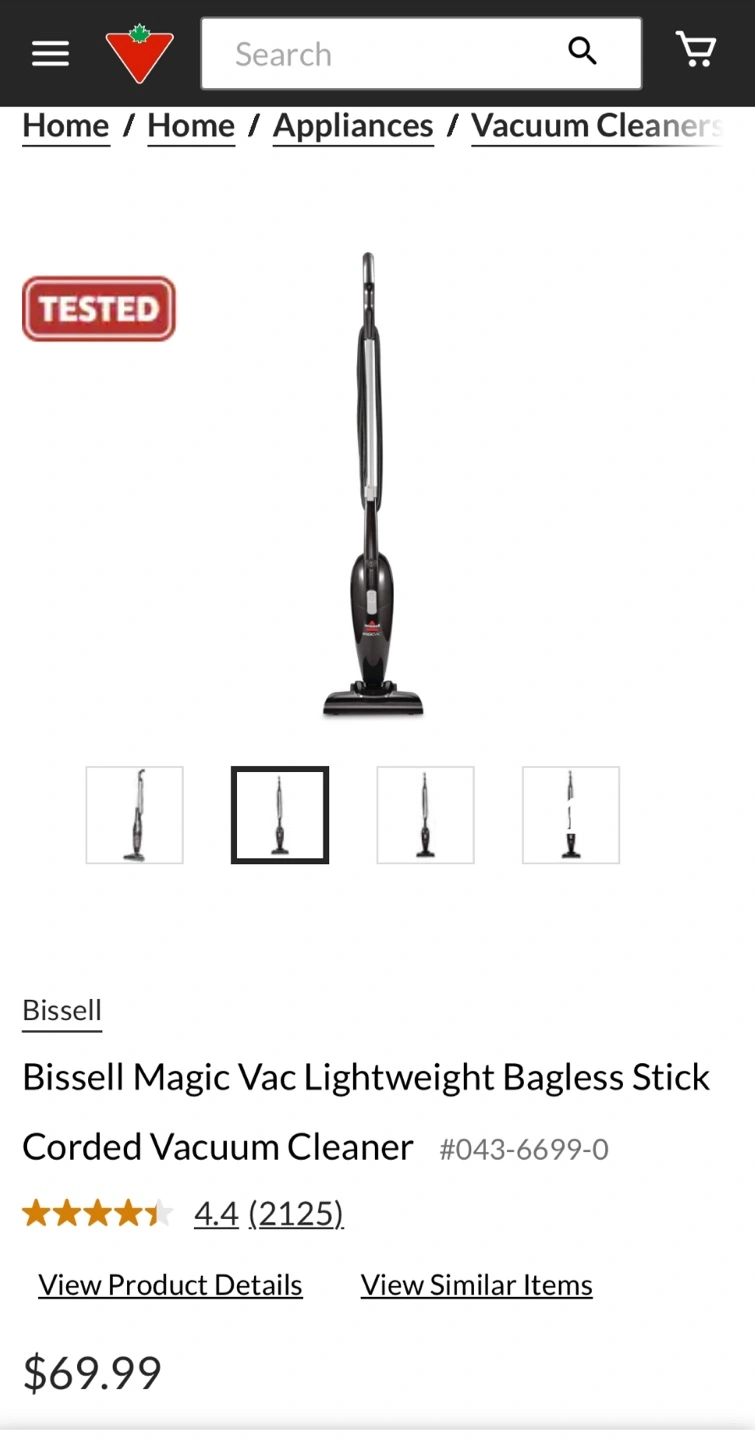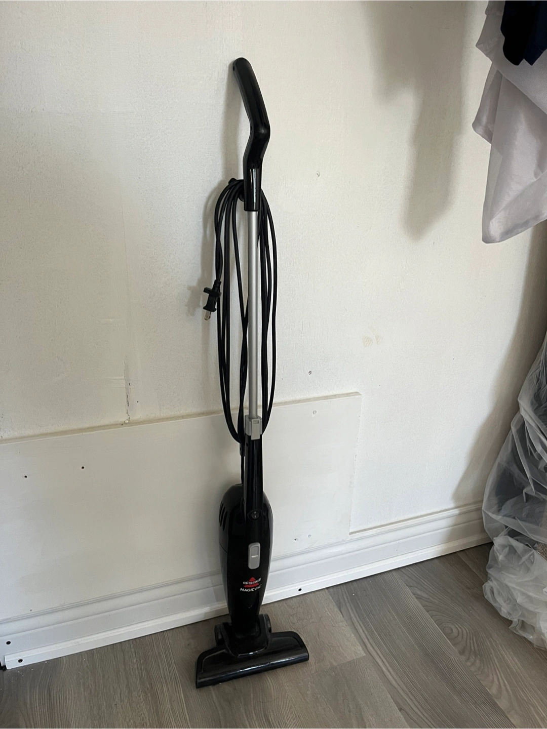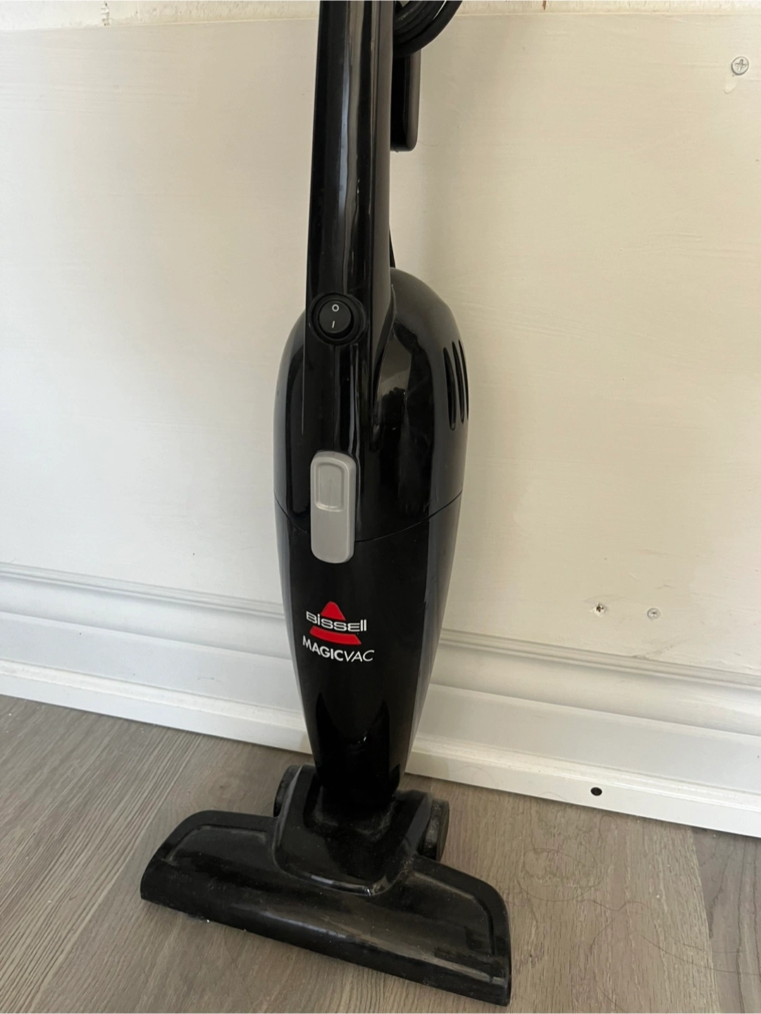 This is a Bissell Magic Vac bagless stick vacuum cleaner. It's corded and lightweight for easy use. This vacuum is suitable for quick cleanups on various floor types. It's a handy tool for keeping your home tidy!